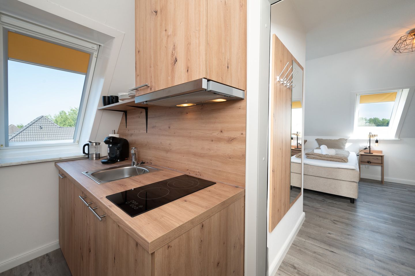 Die Kochnische ist mit einem Kühlschrank, einem 2-Platten-Herd und einer hochwertigen Tassimo-Espressomaschine ausgestattet. Hier können Sie Ihren Tag mit einem frisch gebrühten Kaffee beginnen oder ein köstliches Frühstück zubereiten. Der Esstisch lädt dazu ein, gemeinsam zu speisen und die Urlaubszeit zu genießen. Für Ihre Unterhaltung sorgt der Fernseher in der Wohnung, und kostenfreies WLAN ermöglicht es Ihnen, auch während Ihres Aufenthalts mit der Außenwelt in Kontakt zu bleiben.