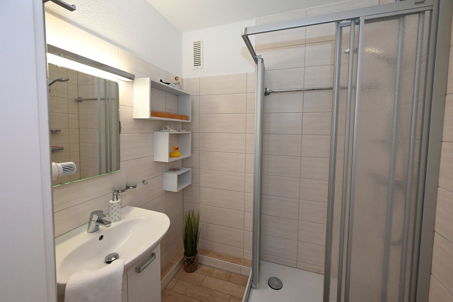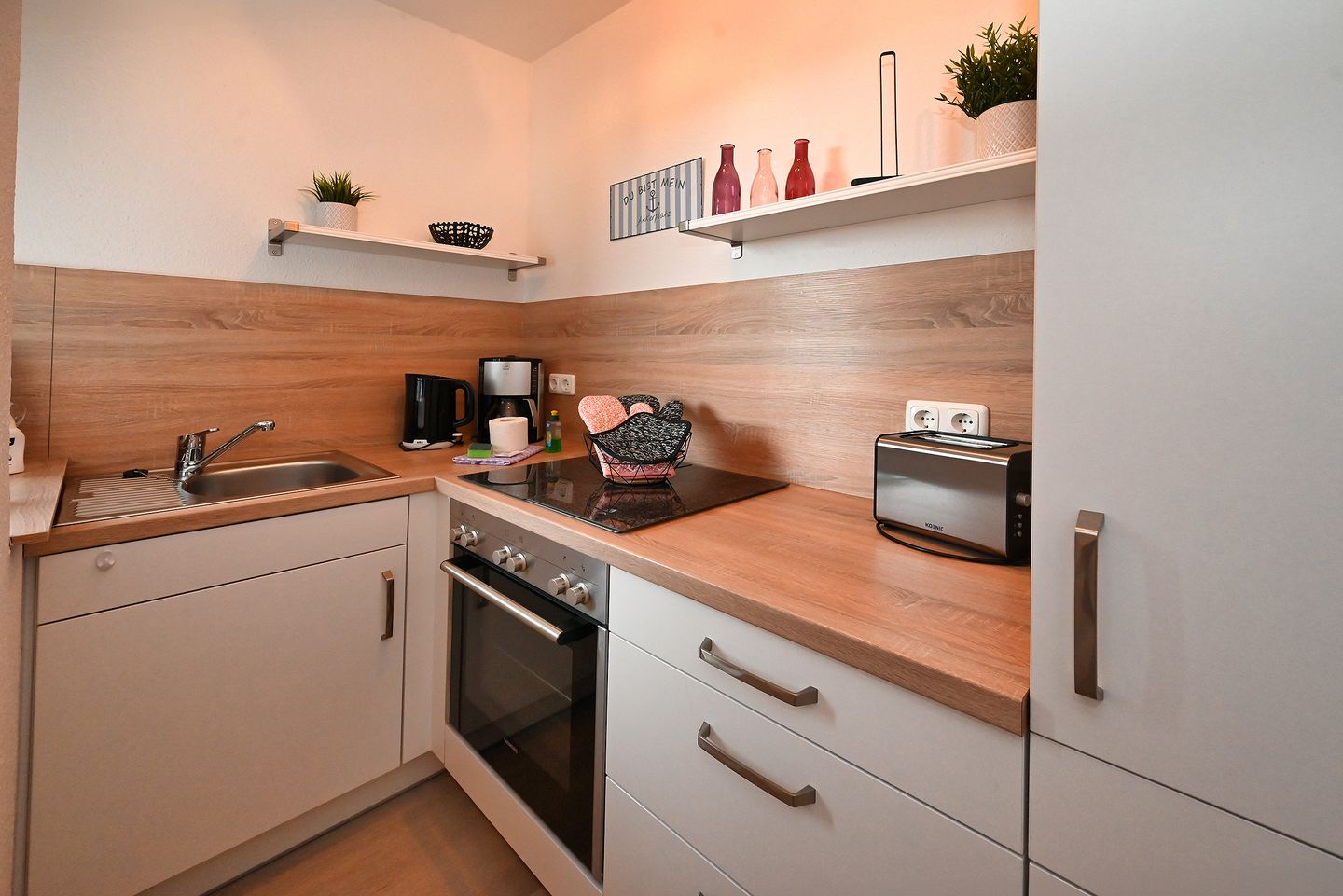 Auf gleicher Ebene befindet sich eine komplett ausgestattete Küche, sowie eine gemütliche Essecke. Das moderne Badezimmer ist mit Dusche und WC ausgestattet.