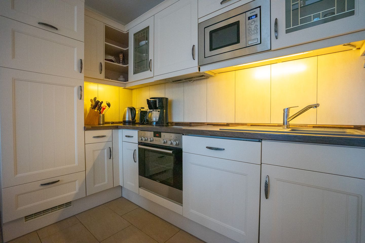 Vom Eingang der Unterkunft aus gelangen Sie in das helle, stilvolle Wohnzimmer, in dem sich auch die neu ausgestattete Küchenzeile befindet, u. a. mit Geschirrspüler und Backofen.