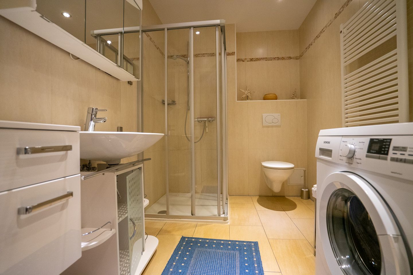 Das geräumige, modern eingerichtete Badezimmer verfügt über einen großzügigen Duschbereich.