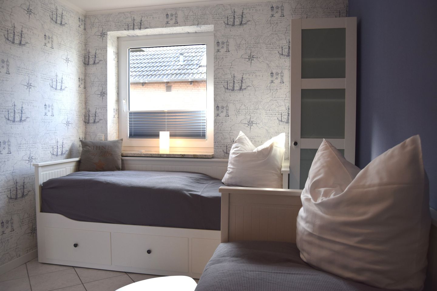 In dem Schlafzimmer mit den beiden Einzelbetten kann eines der Einzelbetten auf 1,60m ausgezogen werden, sodass dort zwei Personen schlafen könnten.