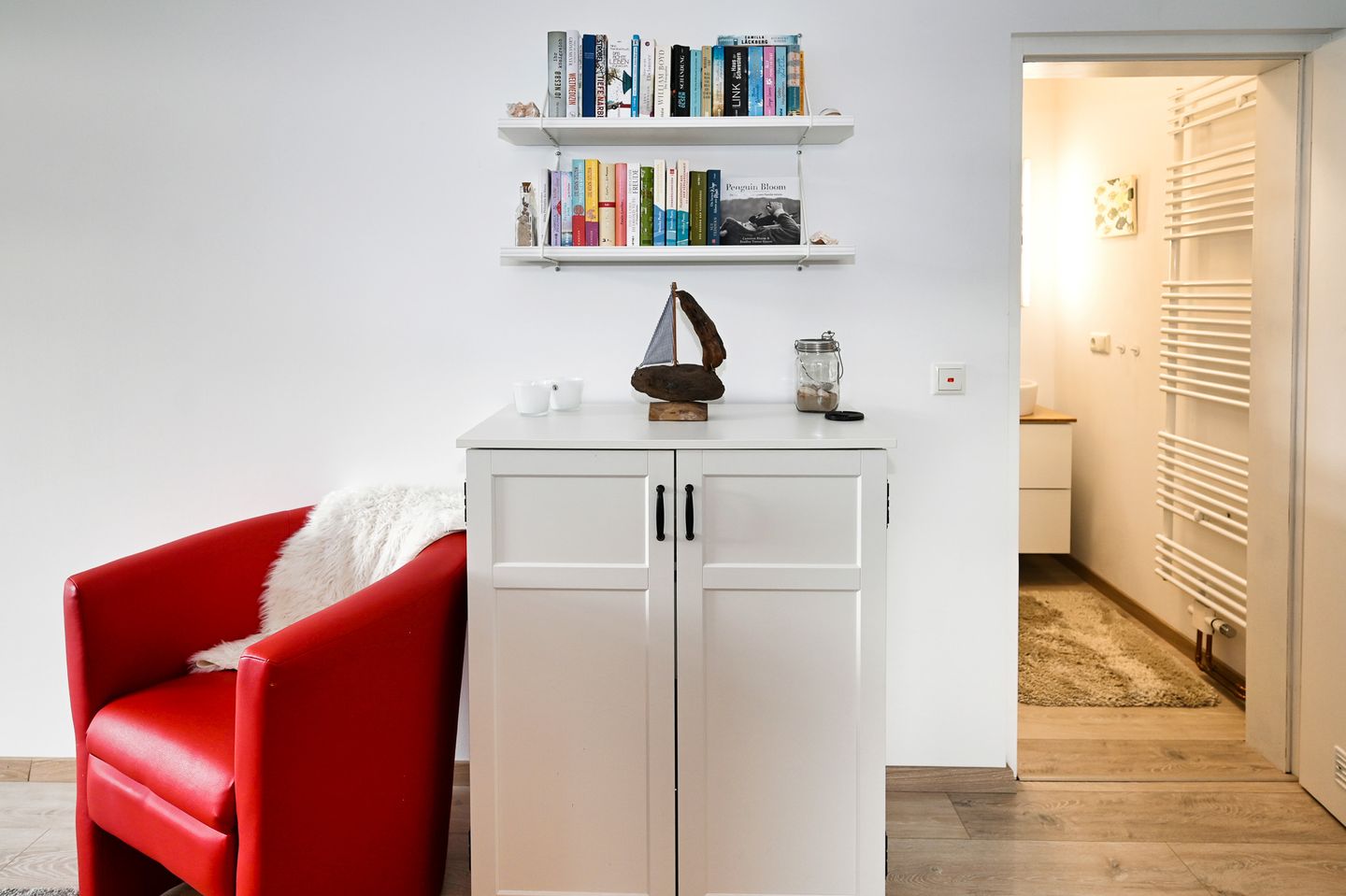 Der Wohnbereich ist modern ausgestattet mit Sofaecke, Sessel, TV sowie WLAN. Für ruhige Stunden stehen außerdem Bücher und ein Radio zur Verfügung. Ein Essbereich mit Hochtisch ist ebenfalls vorhanden.