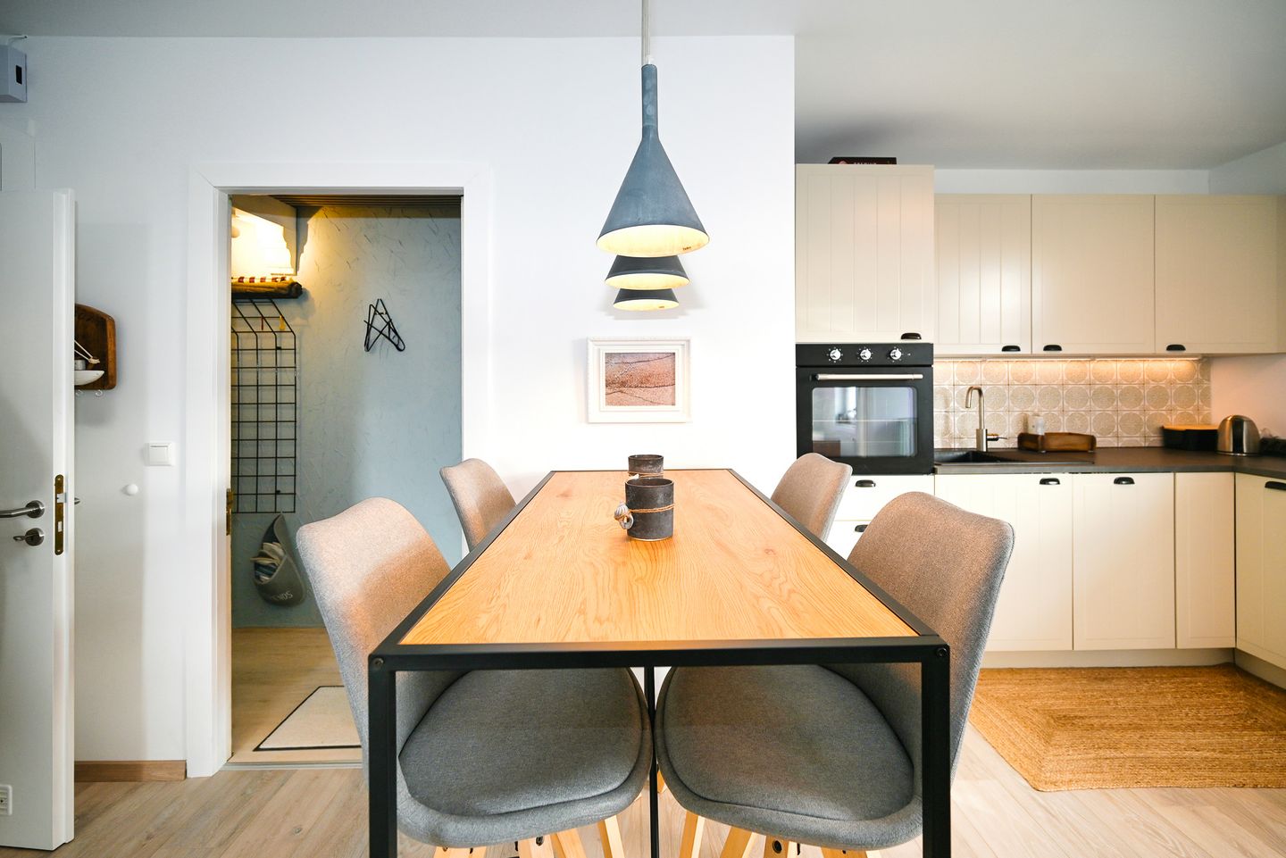 Die Küche ist offen zum Wohnzimmer gestaltet und umfassend ausgestattet: Induktionsherd, Backofen, Spülmaschine, Kühlschrank mit Gefrierfach, Kaffeemaschine, Espressomaschine, Wasserkocher und Toaster.