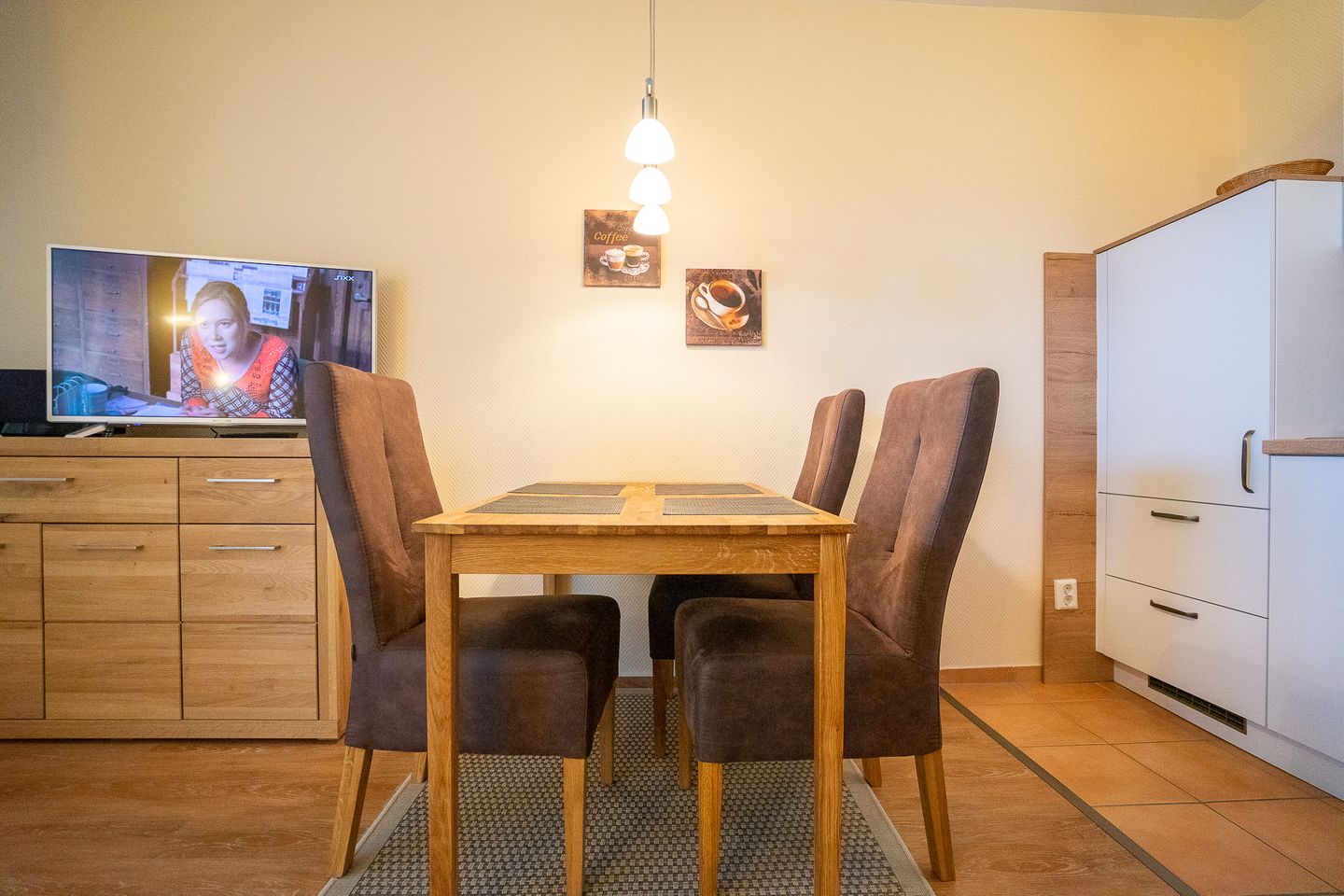 Sie verfügt über einen großzügigen Wohn- und Essbereich, in dem Sie es sich herrlich bequem machen können – zum Beispiel auf dem komfortablen 2-Sitzer-Sofa oder dem entspannten Relax-Sessel.
