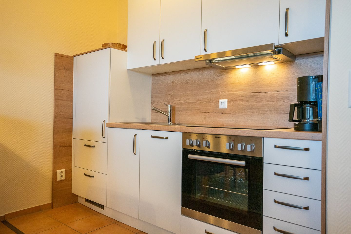 In der integrierten Küchenzeile finden Sie eine Geschirrspülmaschine, einen Kühlschrank mit Gefrierfach und diverse Küchengeräte.