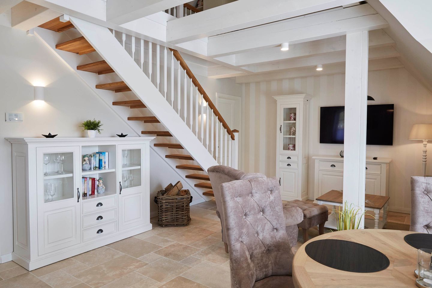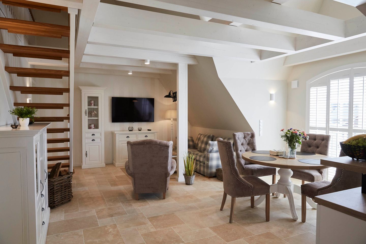 Schon von außen erkennen Sie die typisch traditionelle Reetdachbauweise der Region, die durch Elemente, wie die ,,Klönschnacktür‘‘, den stilechten und handgefertigten Holzfenstern mit Sprossen, den Shuttern, der gemauerten Katzentreppe auf dem Dach und vielem mehr zu erkennen ist.