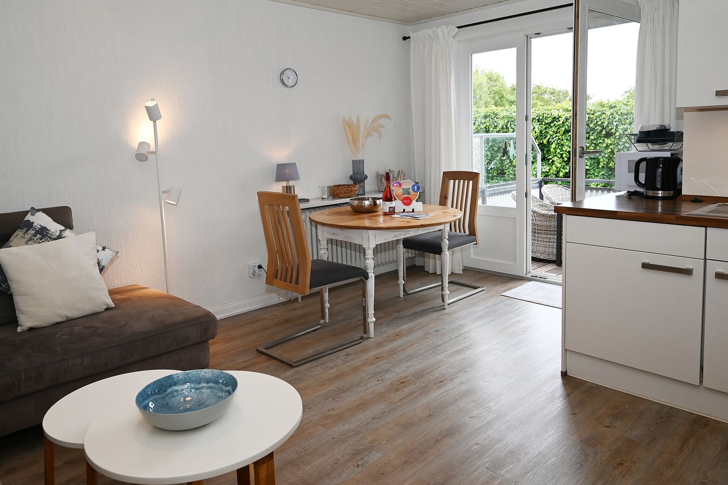 Im komfortablen Wohn- und Essbereich mit integrierter Küche können Sie gemeinsam gemütliche Stunden verbringen. Das Schlafzimmer ist hell und freundlich eingerichtet.
