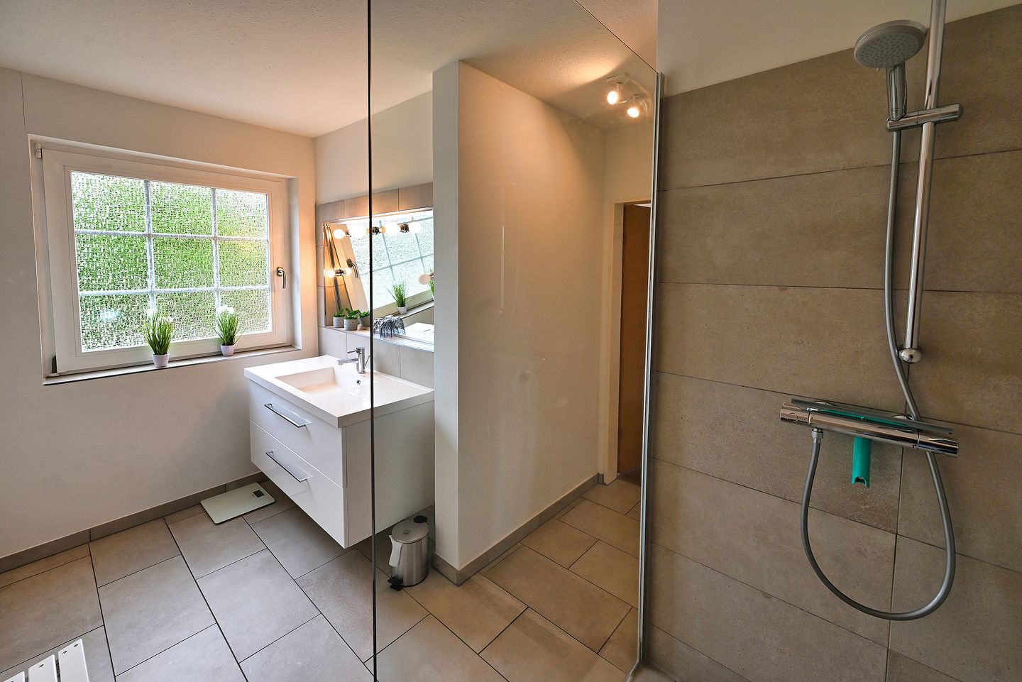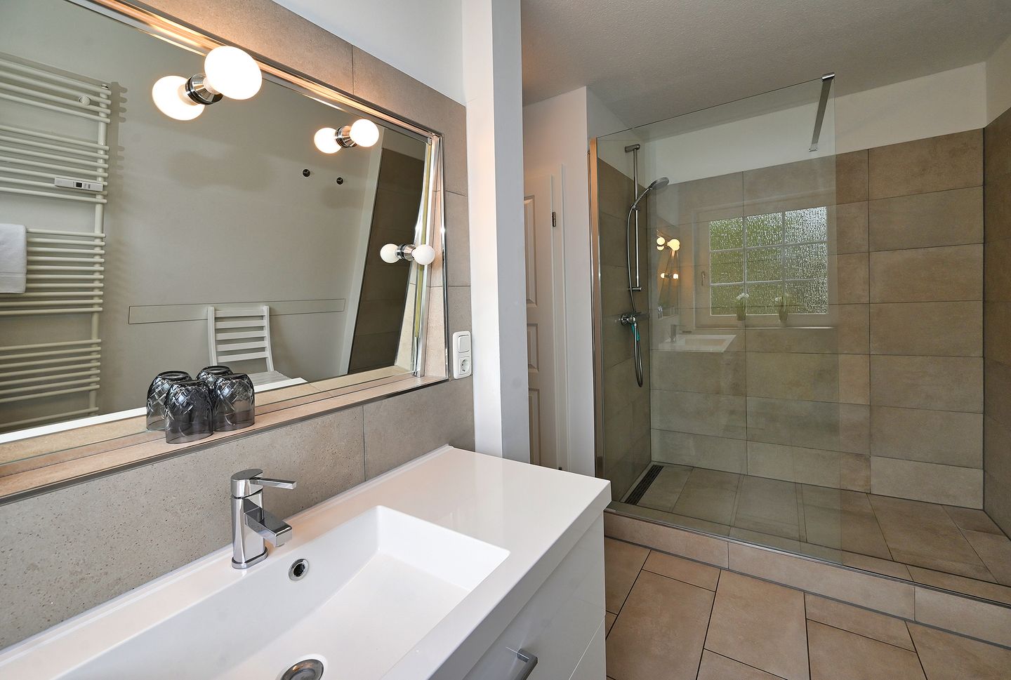 Im modernen Badezimmer mit Fenster erwarten Sie eine Dusche, ein Handtuchheizkörper und ein Waschbecken. Die Toilette befindet sich in einem Extrazimmer.