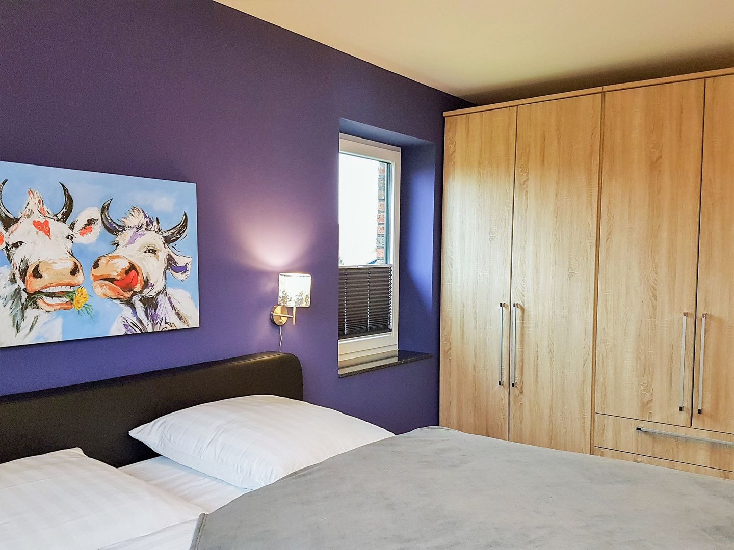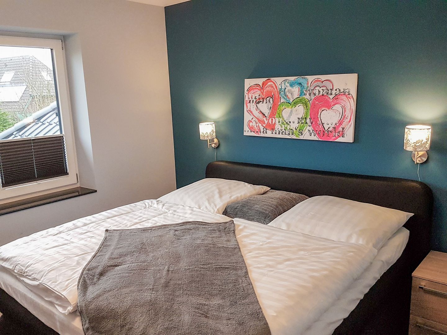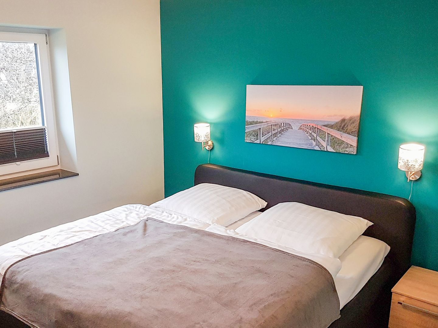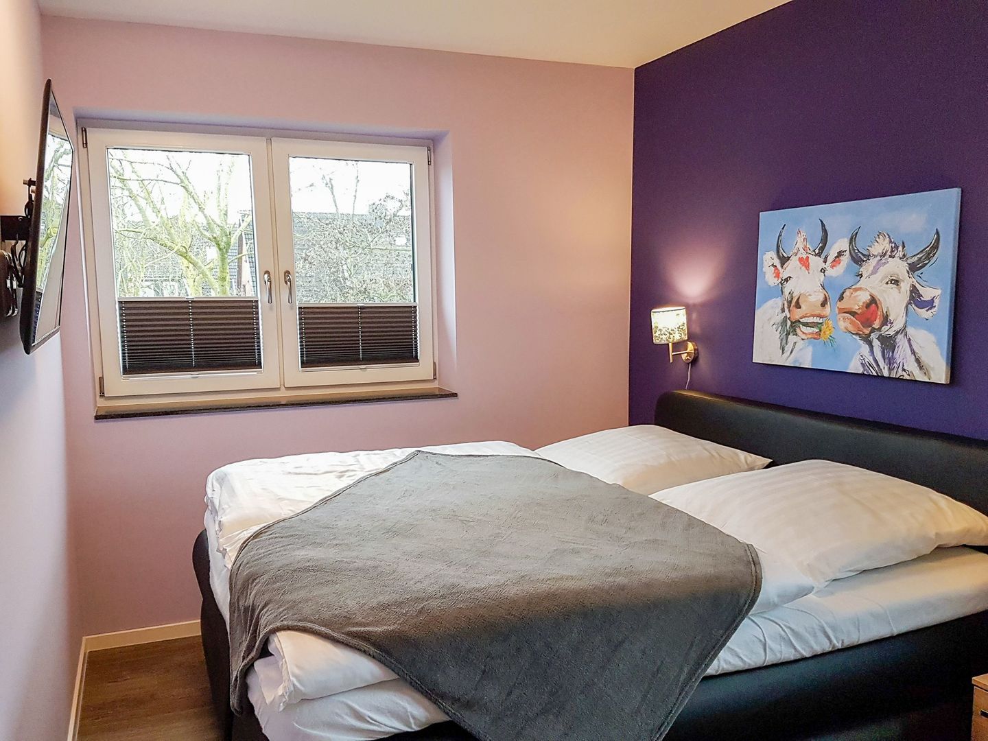 Es gibt drei Schlafzimmer mit Doppel-Boxspringbetten und je einem eigenen TV Gerät mit Internetzugang. In der zweiten Etage