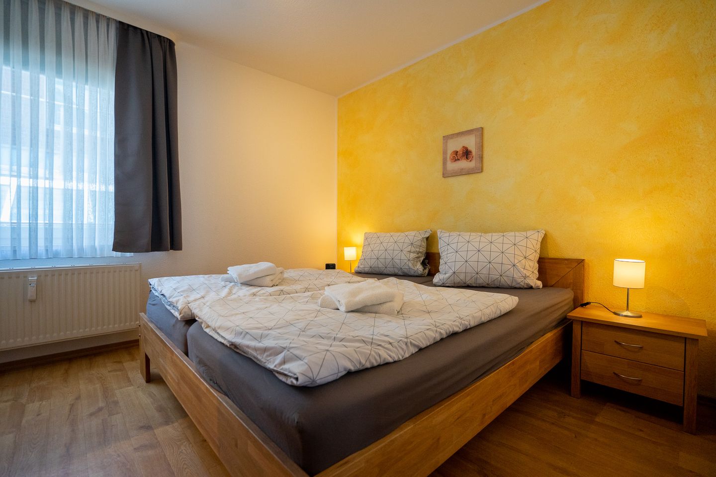 Die Wohnung verfügt über drei Schlafzimmer, jeweils mit einem Doppelbett. So finden sechs Personen entspannt Platz. Ein großer Komfort sind die zwei Badezimmer.