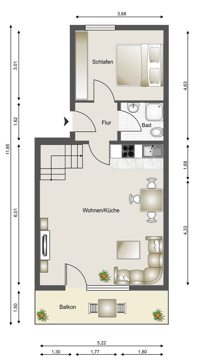 Die Küche ist offen zum Wohnzimmer ausgerichtet. Von dort aus haben Sie Zugang zu Ihrem Balkon. Bei gutem Wetter können Sie Ihr Frühstück bei Morgensonne genießen.