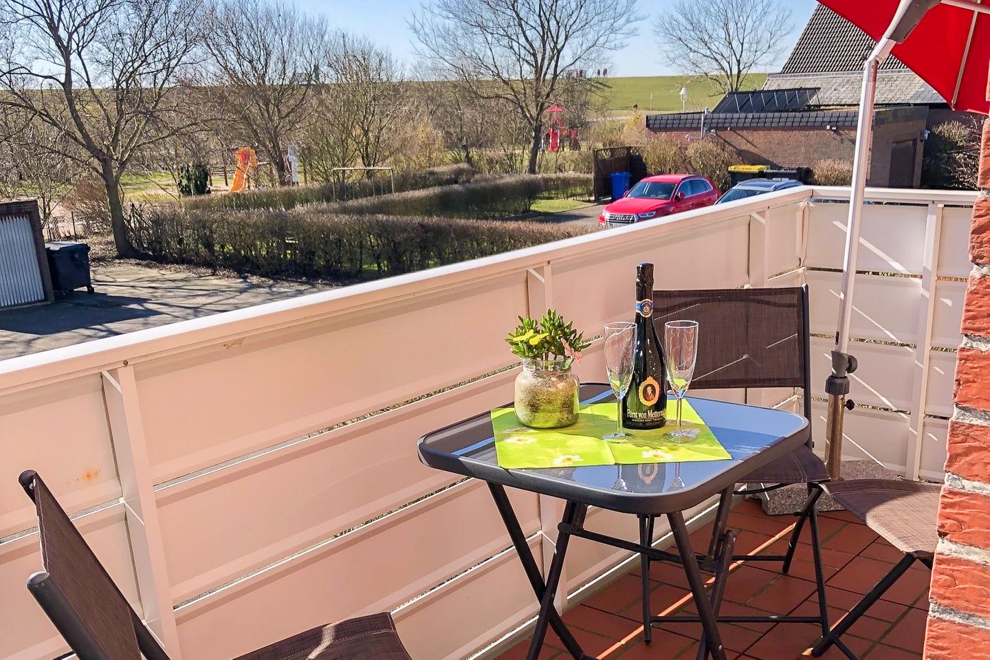Zwei Balkone, 90 Quadratmeter Wohlfühlraum: Moin aus Ihrem neuen Urlaubsdomizil, gerade einmal 200 Meter vom Deich entfernt.