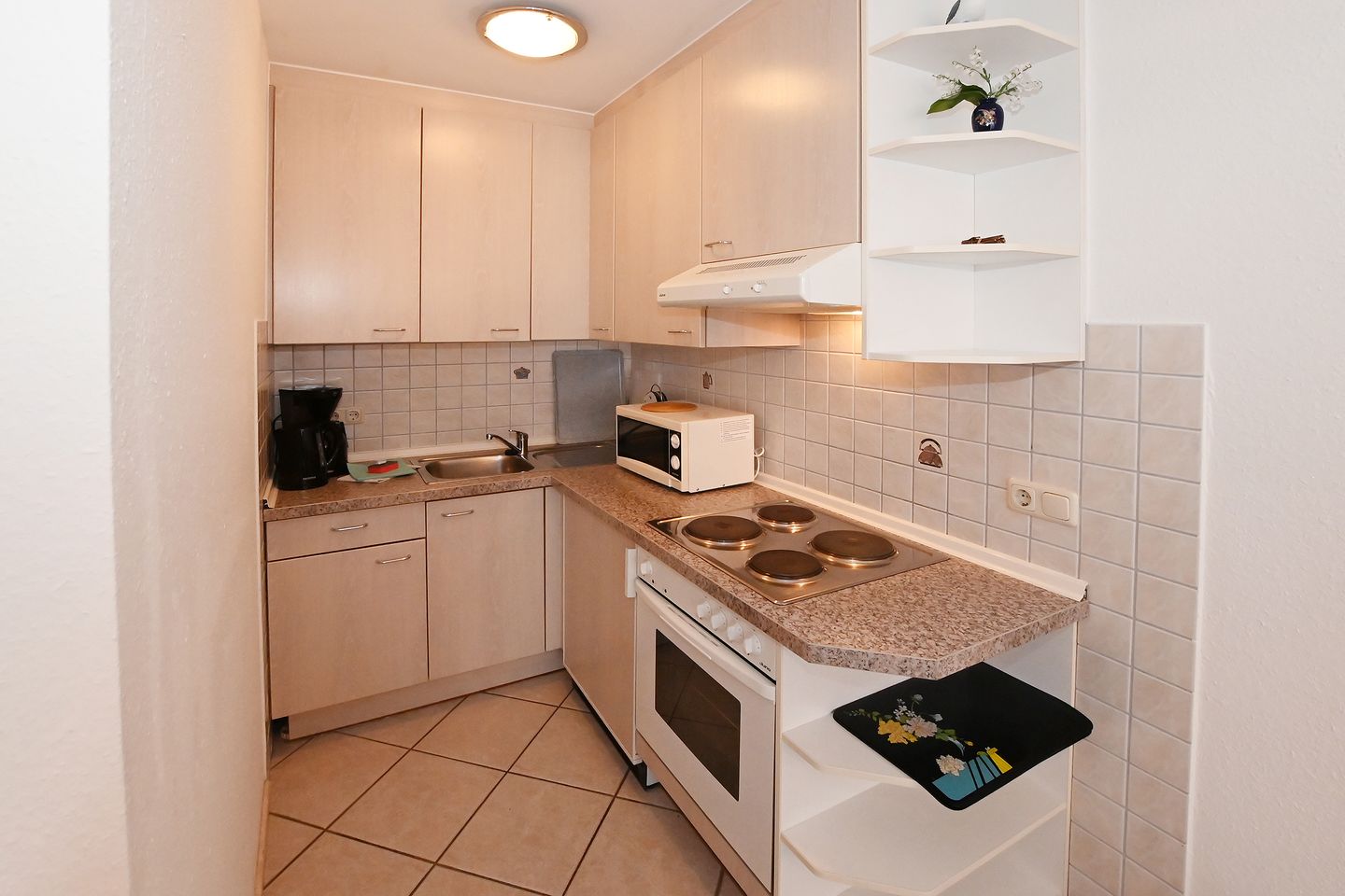 Auf gleicher Ebene befindet sich eine komplett ausgestattete Kochnische sowie eine gemütliche Essecke. Das moderne Badezimmer ist mit Glasdusche und WC ausgestattet. Das Schlafzimmer befindet sich im ruhigen, hinteren Teil der Wohnung.
