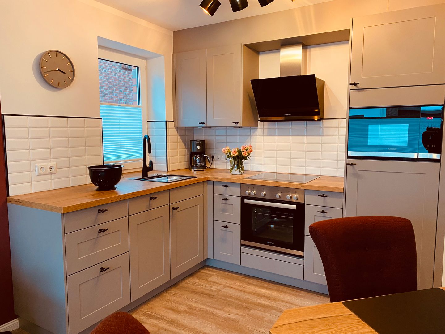 Auf gleicher Ebene befindet sich eine komplett ausgestattete Kochnische, sowie eine gemütliche Essecke.