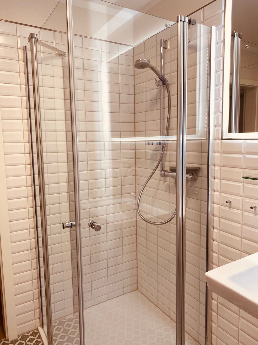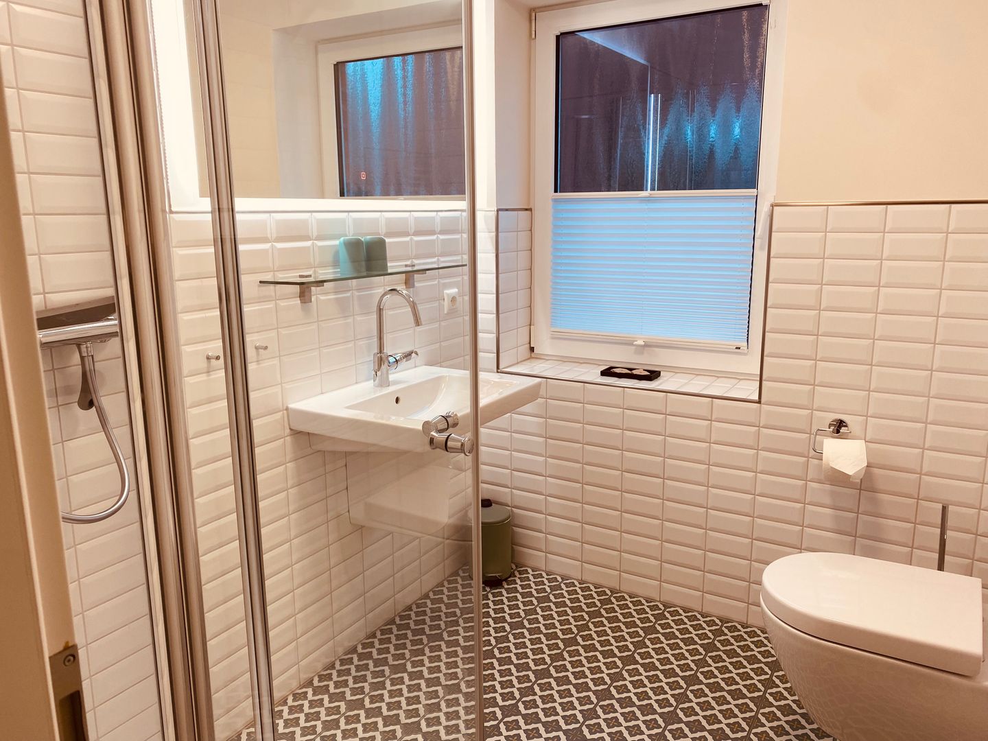 Das geräumige, moderne Badezimmer ist mit Glasdusche und WC ausgestattet.