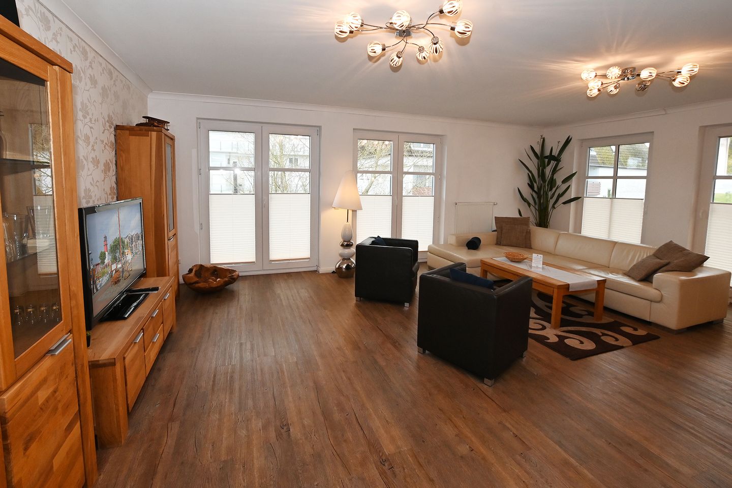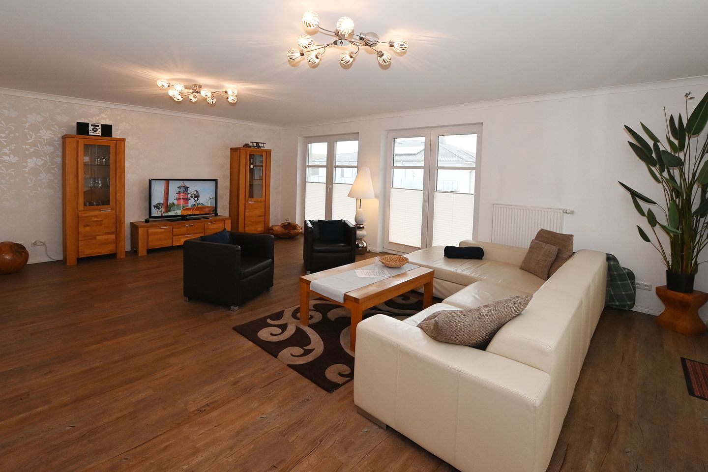 Das lichtdurchflutete Wohnzimmer lädt zu einem harmonischen Aufenthalt ein.