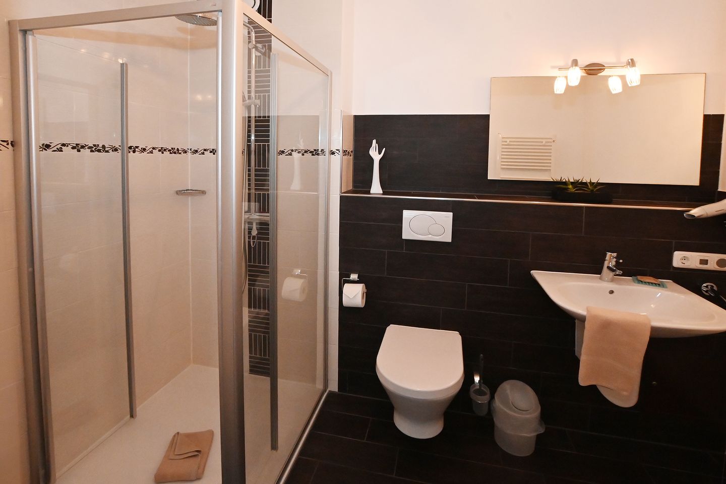 Die zwei modernen und hellgefliesten Badezimmer sind mit einer Glasdusche und einem WC ausgestattet.