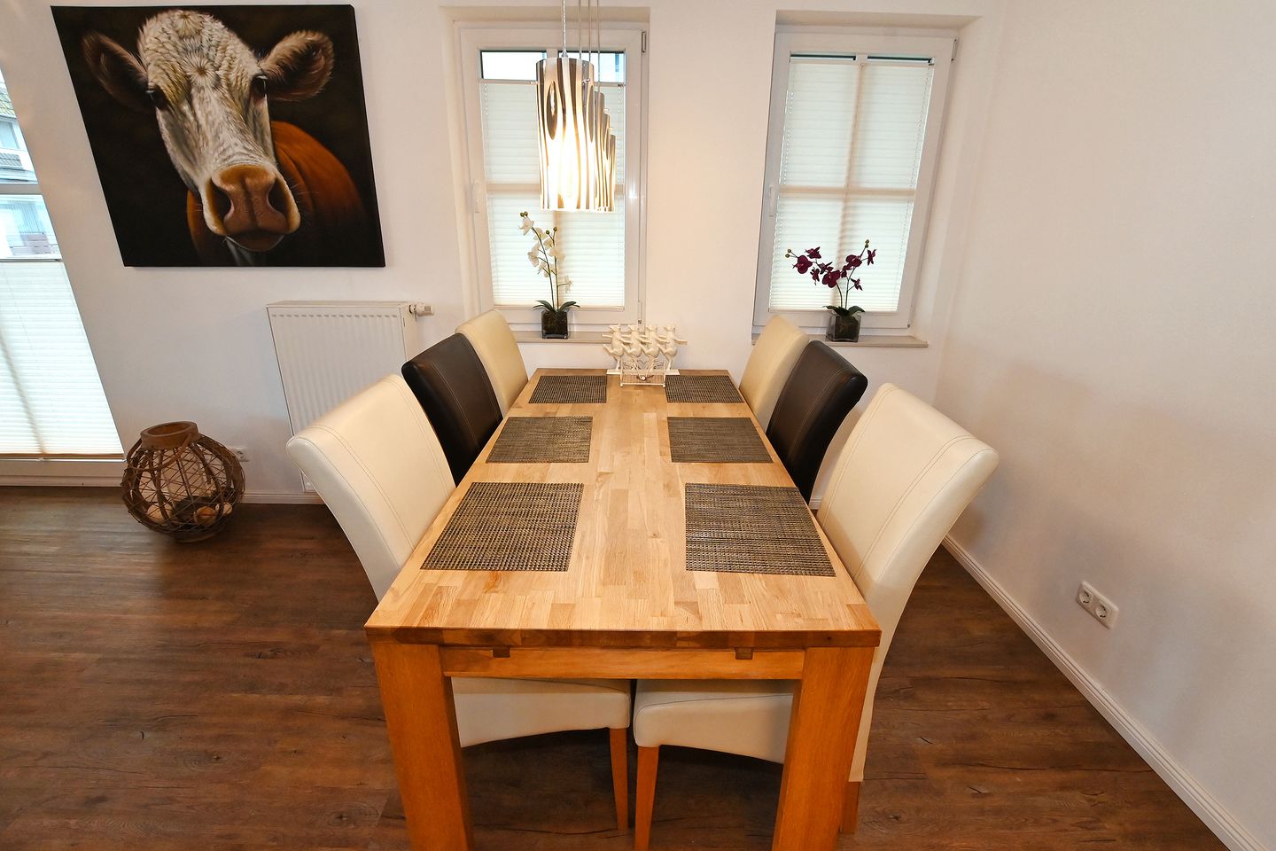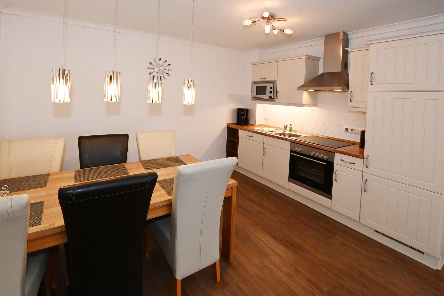Die vollausgestattete Küche inklusive komfortablen Esstisch grenzt direkt an das Wohnzimmer an.