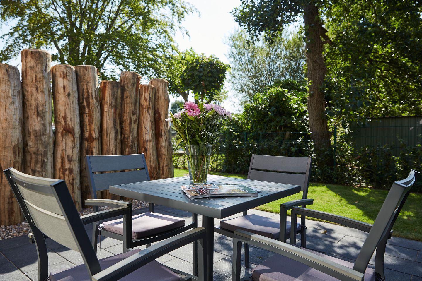 Die großzügige Terrasse, umrahmt von der schönen Außenanlage, lädt zur Entspannung ein.
