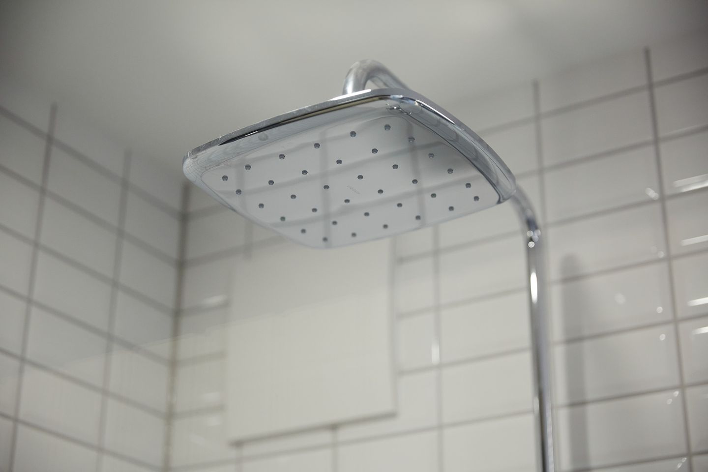 Das luxuriöse Badezimmer verfügt über eine große ebenerdige Dusche, einen Handtuchheizkörper sowie einen Föhn.
