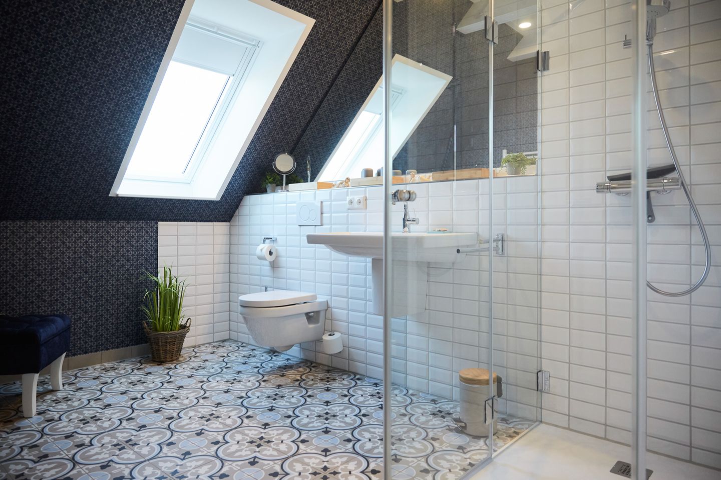 Das luxuriöse Badezimmer verfügt über eine große ebenerdige Dusche, einen Handtuchheizkörper sowie einen Föhn. Wie in der gesamten Wohnung, fällt auch hier die liebevolle Dekoration auf.