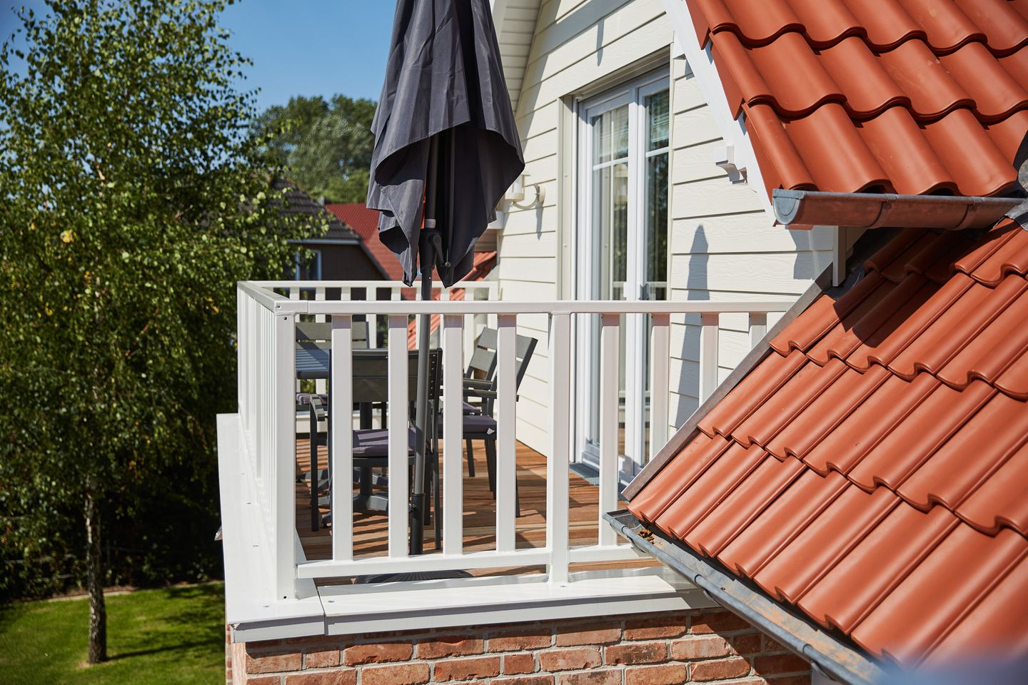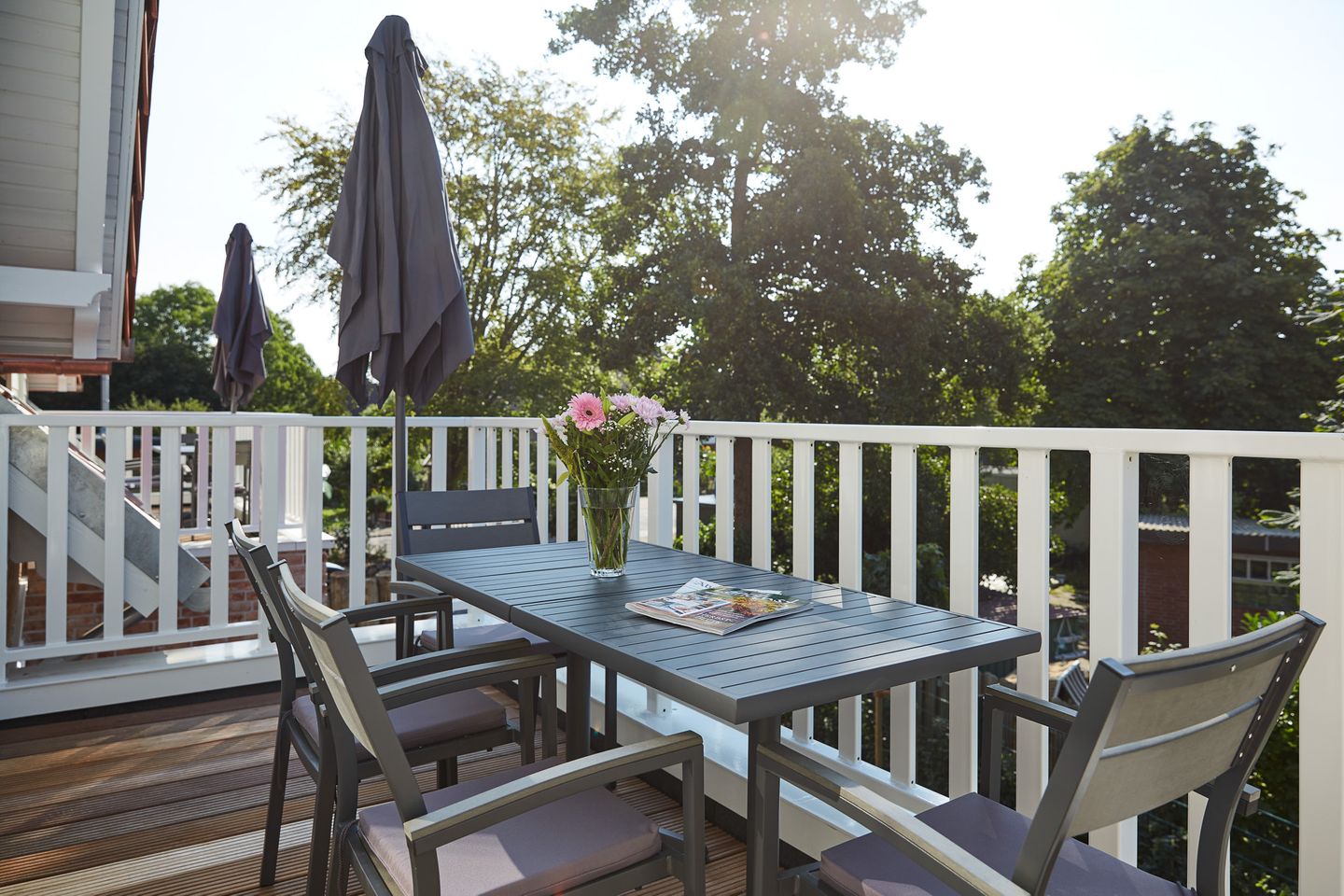 Auf dem großzügigen Balkon, umrahmt von der schönen Außenanlage, entspannen Sie perfekt.
