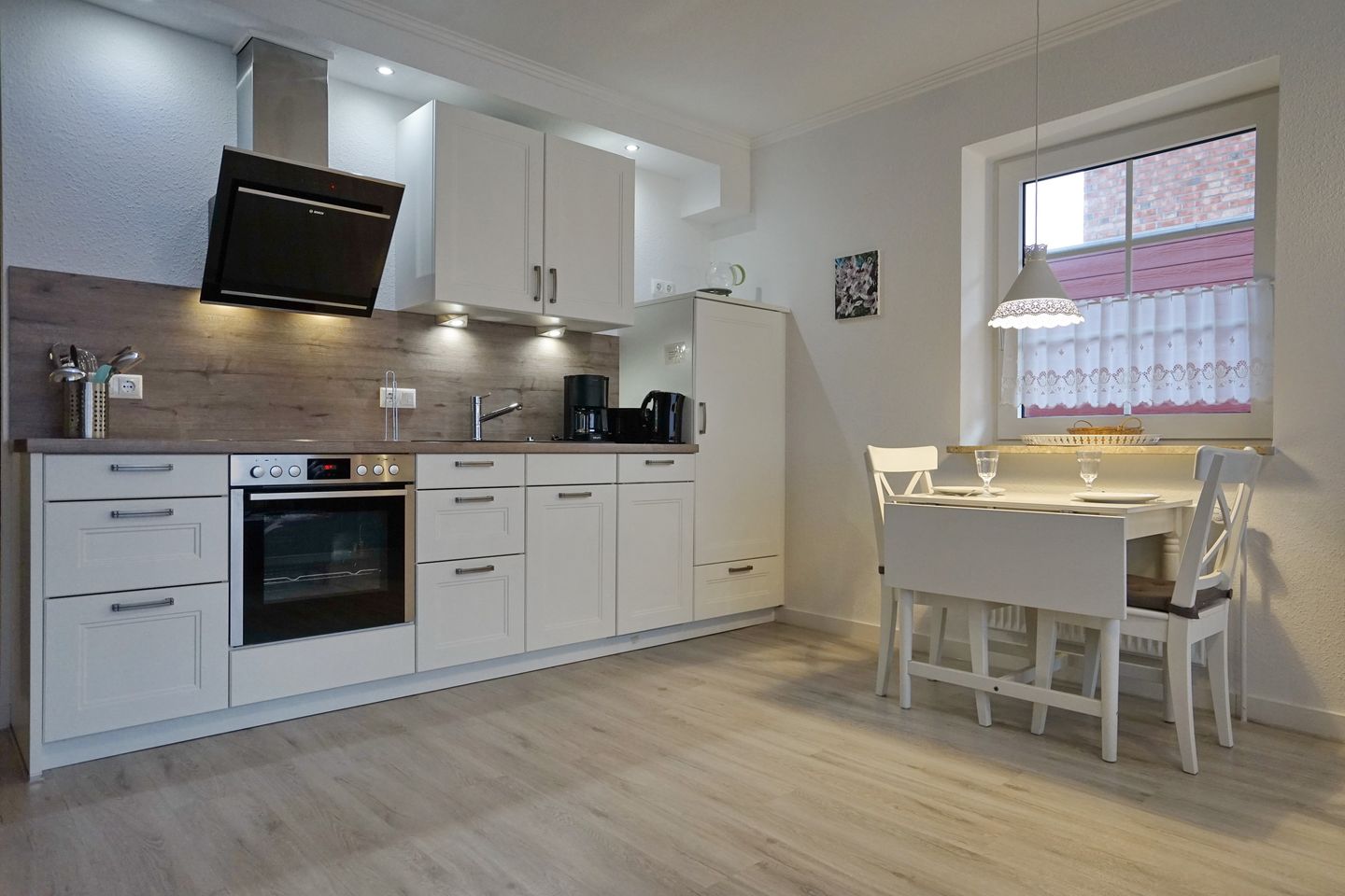 Der Wohnbereich ist liebevoll im britischen Stil eingerichtet – und da es nicht nur Fish & Chips sein sollen, bietet die moderne Küche mit Ceranfeld, Umluftofen, Geschirrspüler und den gewohnten Haushaltsgeräten den nötigen Komfort zum Kochen.