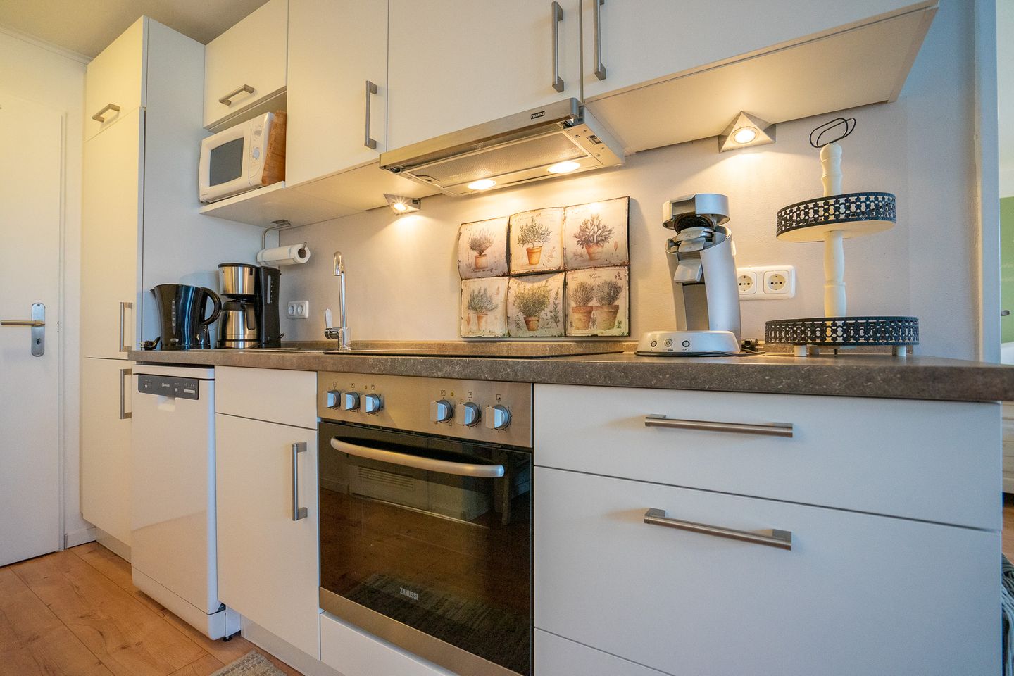 Die helle und freundlich eingerichtete Küche rundet das Gesamtbild ab. Die Wohnung bietet Platz für bis zu drei Personen. Der Balkon ist vom Wohnbereich und vom separaten Schlafzimmer zu erreichen und lädt zu entspannten Stunden ein. In dem Wohnkomplex ist ein Fahrstuhl, womit Sie bequem Ihre Wohnung in der zweiten Etage erreichen können.