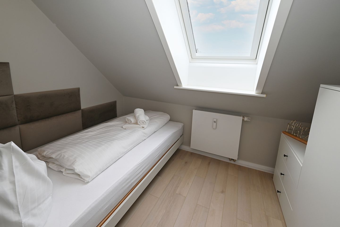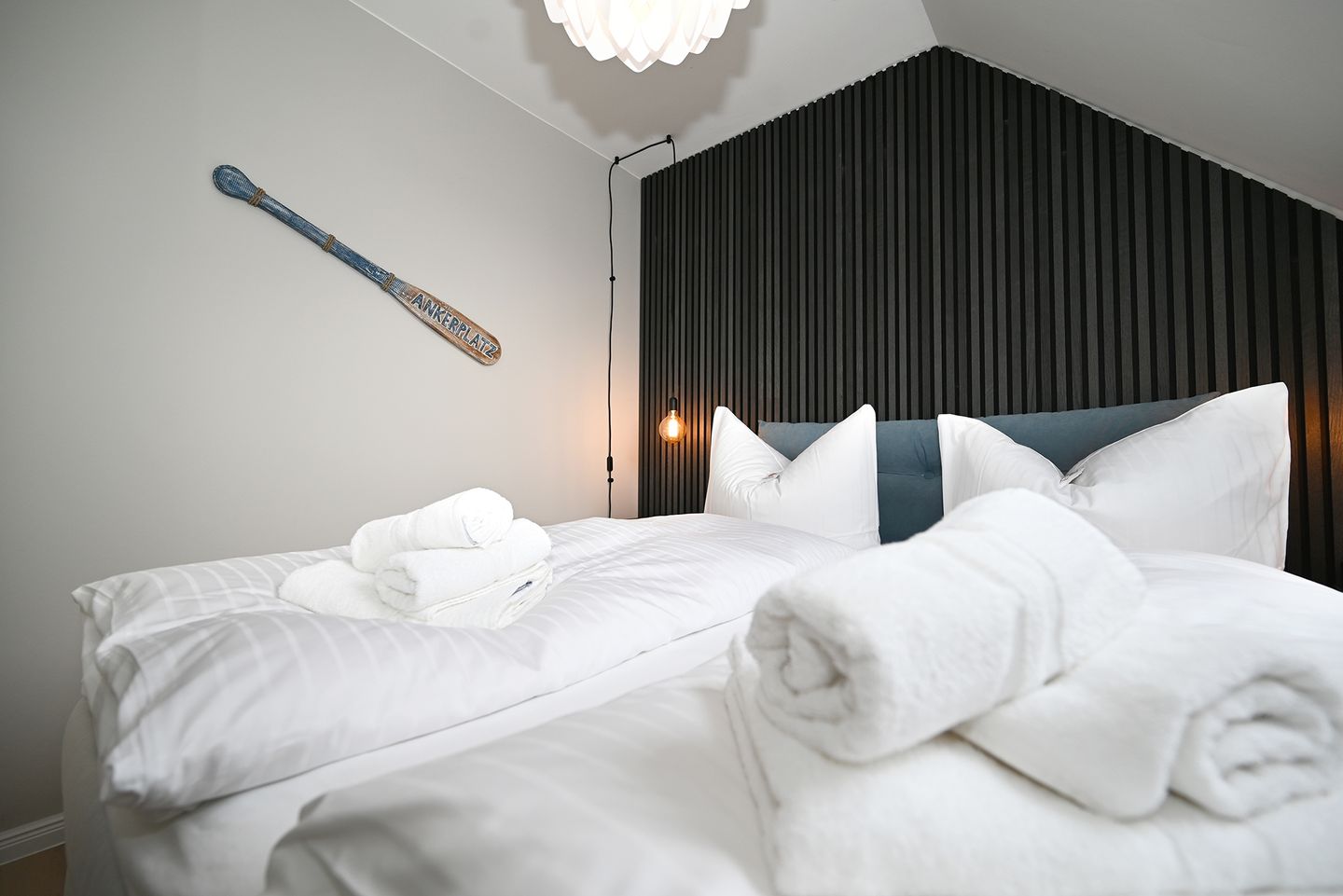 Genießen Sie Ihren Aufenthalt in der 3 Raum Ferienwohnung. Die Wohnung ist aufgeteilt in 2 Schlafzimmer mit einem Doppelbett (1,60 x 2,00 Meter) und einem Einzelbett (Sonderanfertigung 0,90 x 1,90 Meter).