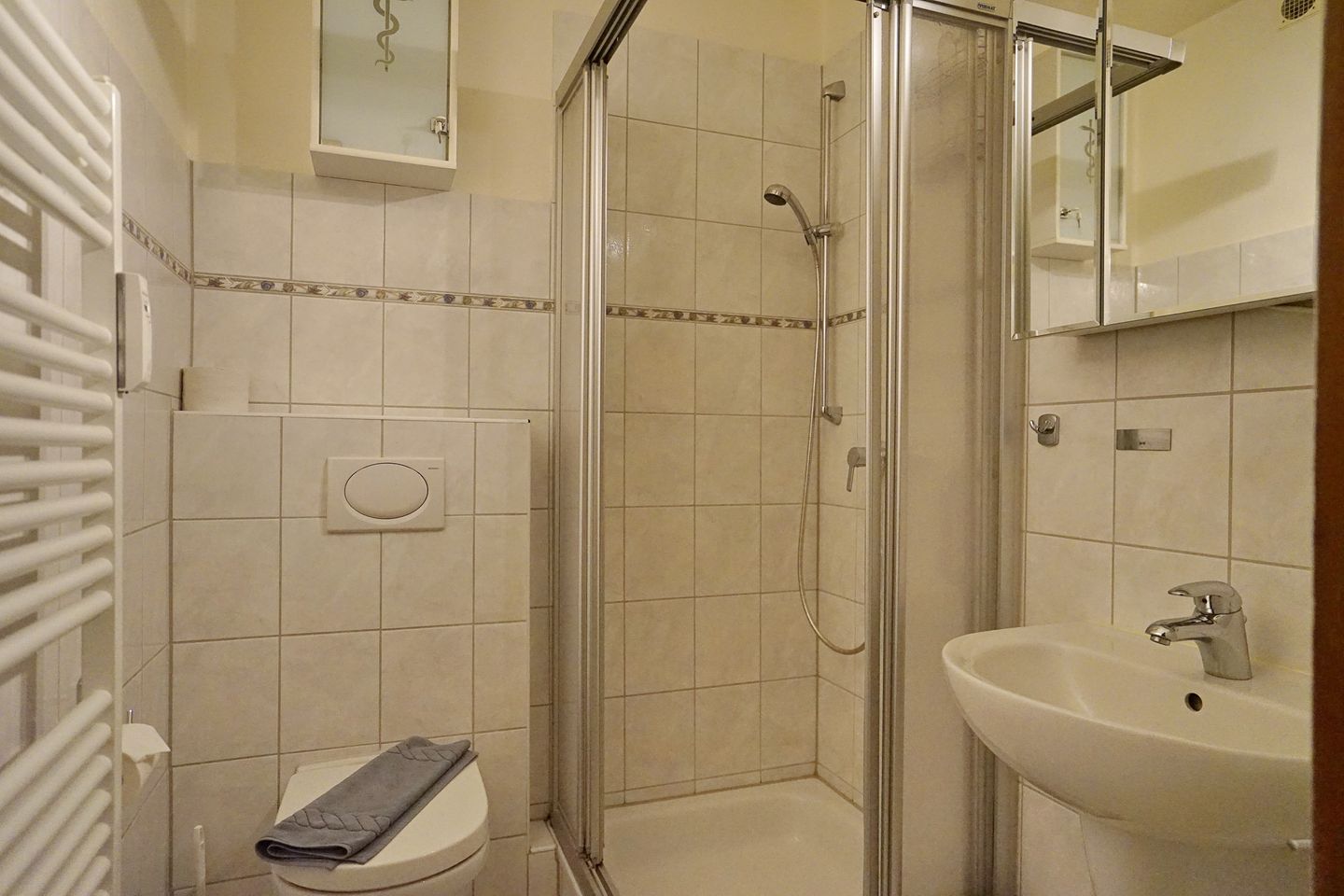 Duschbad und einer kleinen Küche. Die Küche ist ausgestattet mit Backofen und