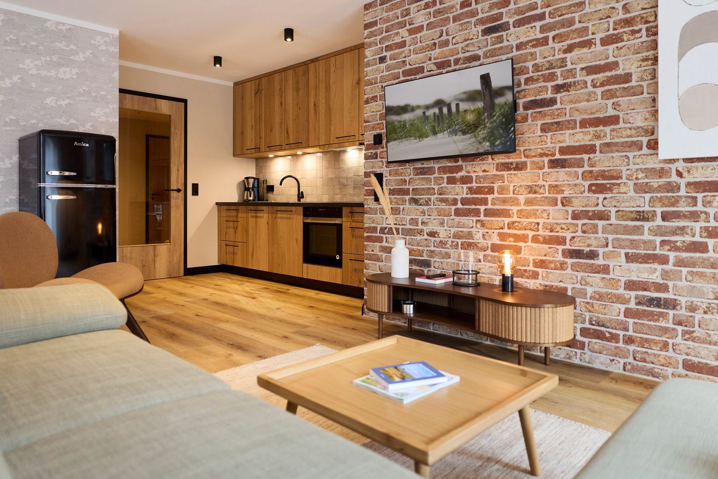 Auf rund 85 Quadratmetern finden vier Gäste Ihr kleines Urlaubsrefugium mit nordischem Wohlfühldesign. Genießen Sie das entspannte Ambiente im lässigen Industrial Style, das gleichzeitig jede Menge Cozyness versprüht.