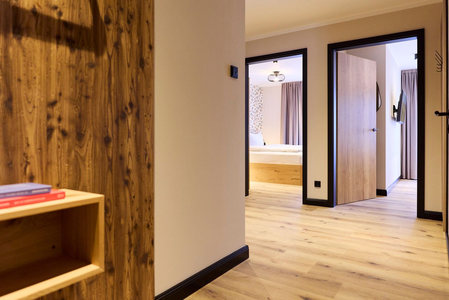 Der offen gestaltete Wohn-Essbereich mit integrierter Küche wird von zwei Seiten mit Tageslicht durchflutet. Ein großer Esstisch ist ein Ort zum Zusammensein ebenso wie die gemütliche Sofaecke in hellem Naturton. Auf der möblierten Terrasse lässt sich der Urlaubstag mit einem Frühstück in der Sonne beginnen. Die zwei Schlafzimmer sind mit je einem komfortablen Doppelbett, Schrank und Smart TV ausgestattet. Zudem verfügt das Apartment über ein modernes, mit anthrazitfarbenen Natursteinfliesen gestaltetes Badezimmer und ein separates WC.