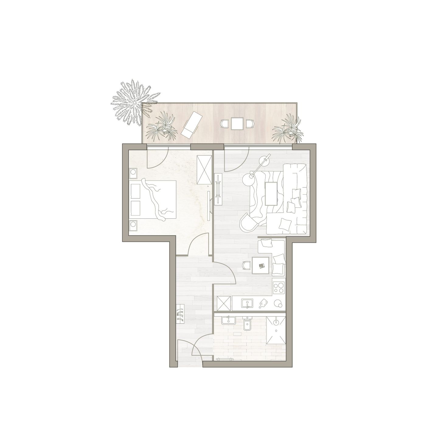 Der offen gestaltete Wohn-Essbereich mit integrierter Küche wird von Nord-Osten mit Tageslicht durchflutet. Ein kleiner Esstisch ist ein Ort zum Zusammensein ebenso wie die gemütliche Sofaecke in hellem Naturton. Auf der geschützten, möblierten Terrasse lässt sich der Urlaubstag mit einem Frühstück in der Sonne beginnen. Das separate Schlafzimmer ist mit einem komfortablen Doppelbett, Schrank und Smart TV ausgestattet. Ein Plus: der direkte Zugang zur Terrasse! Zudem verfügt das Apartment über ein modernes, mit Natursteinfliesen gestaltetes Bad.