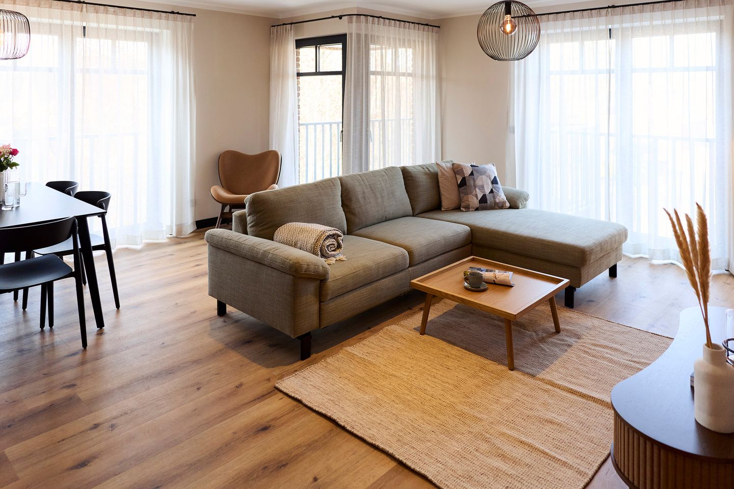 Der offen gestaltete Wohn-Essbereich mit integrierter Küche wird von zwei Seiten mit Tageslicht durchflutet. Der große Esstisch ist ein Ort zum Zusammensein ebenso wie die gemütliche Sofaecke in hellem Naturton.