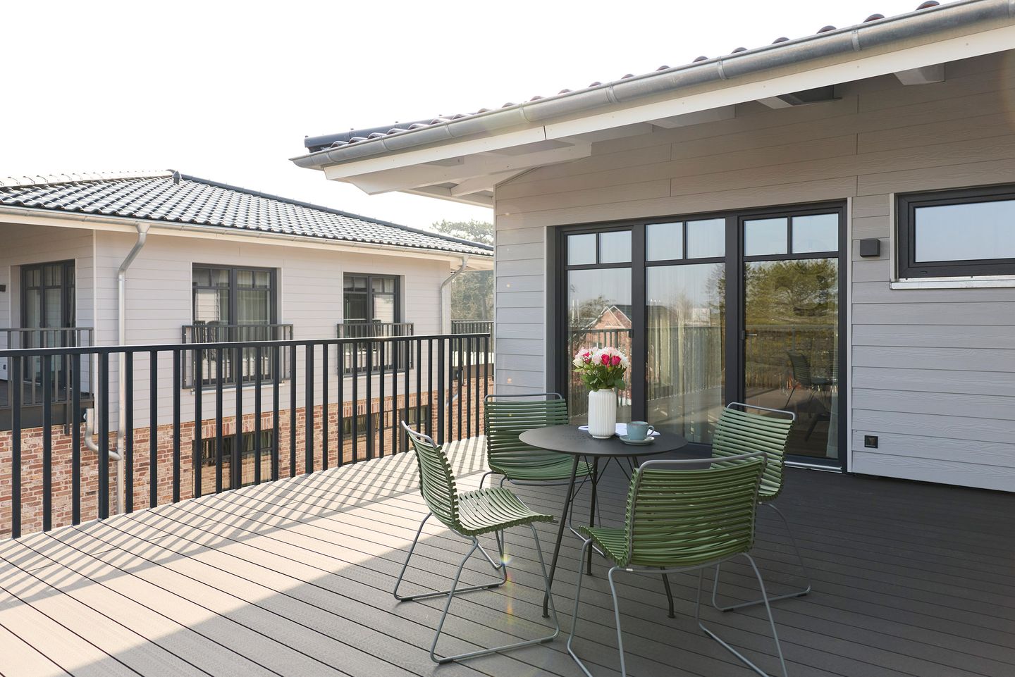 Die großzügige, möblierte Dachterrasse in Nord-Ost/Nord-West-Lage bietet Raum für entspannte Momente. Das Schlafzimmer ist mit einem komfortablen Doppelbett, Schrank und Smart TV ausgestattet. Ein Plus: ein eigener Balkon! Zudem verfügt das Apartment über ein modernes, mit anthrazitfarbenen Natursteinfliesen gestaltetes Badezimmer.