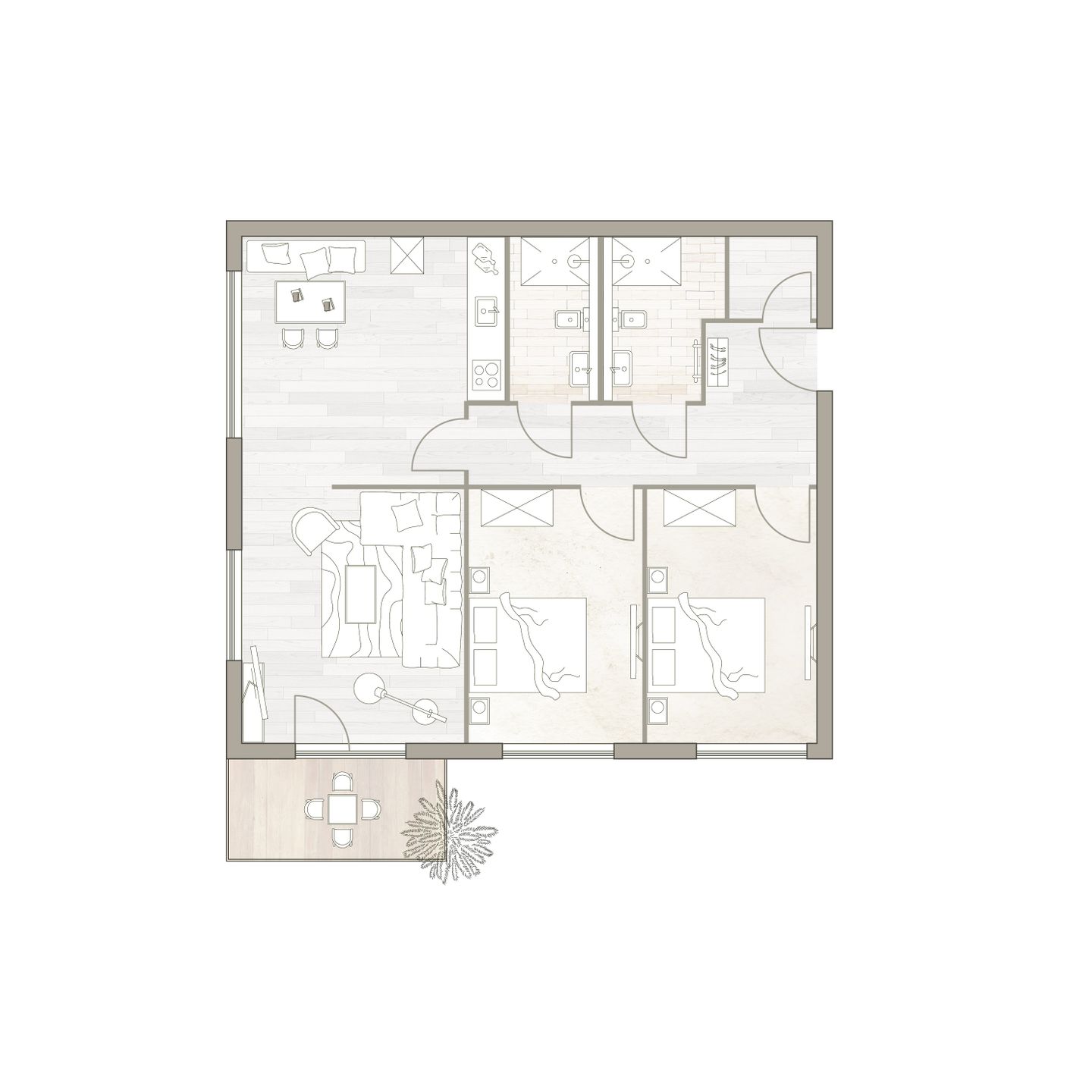 Die möblierte Süd-West-Terrasse bietet fast den ganzen Tag lang Sonne. Die zwei Schlafzimmer sind mit je einem komfortablen Doppelbett, Schrank und Smart TV ausgestattet. Zudem verfügt das Apartment über ein modernes, mit Natursteinfliesen gestaltetes Badezimmer, ein separates WC und einen Abstellraum.