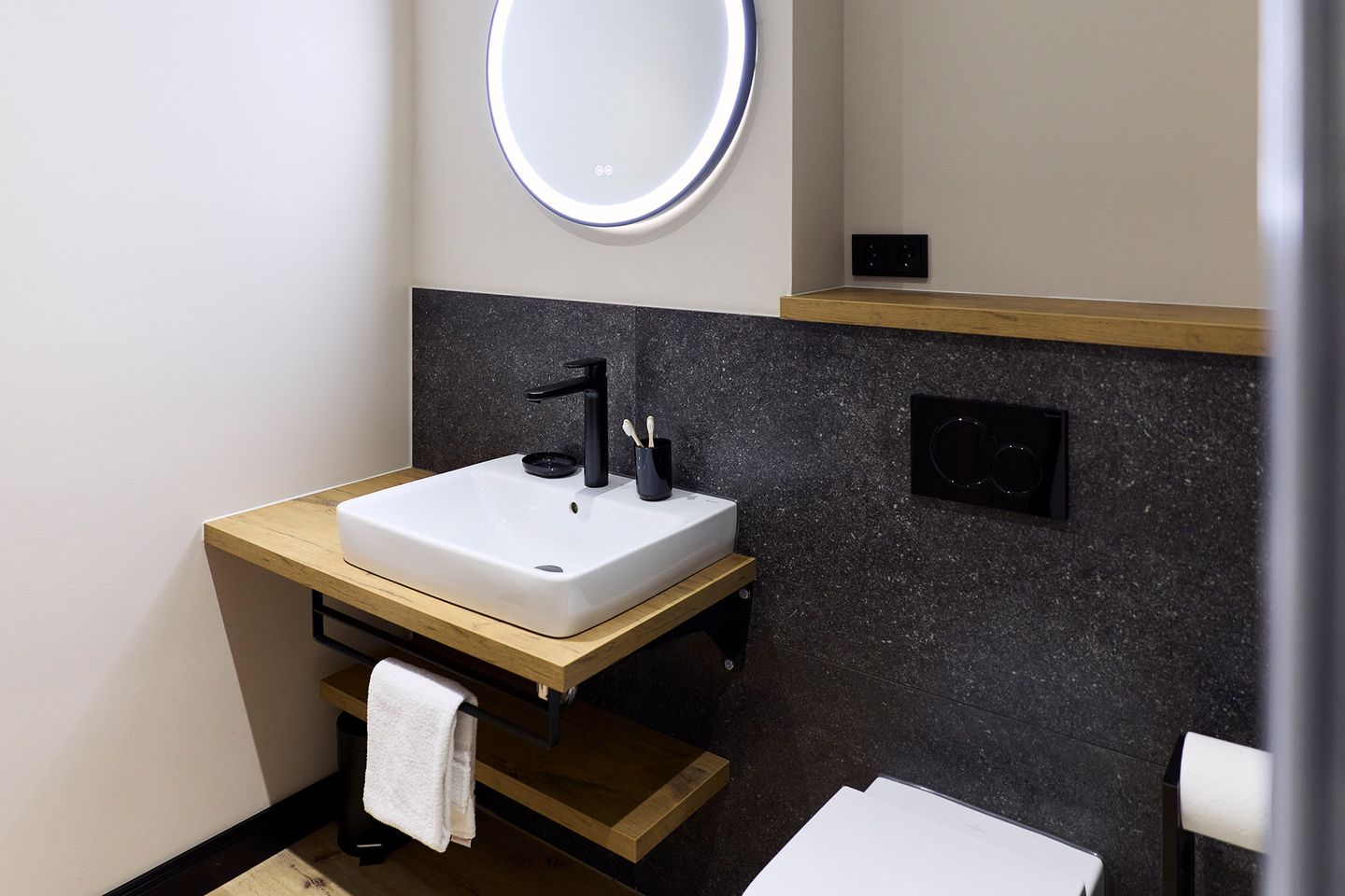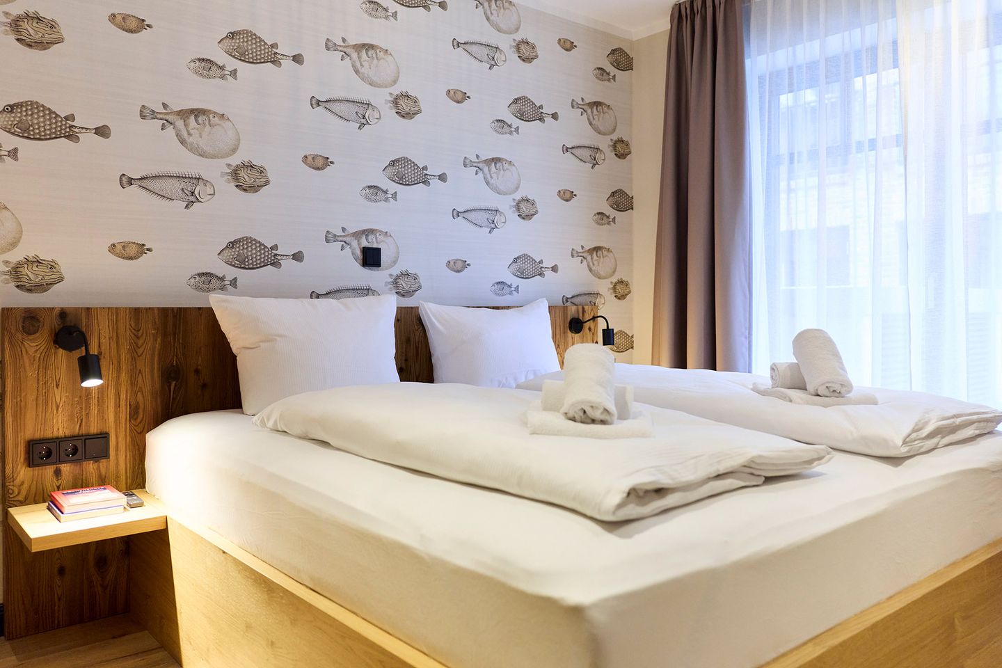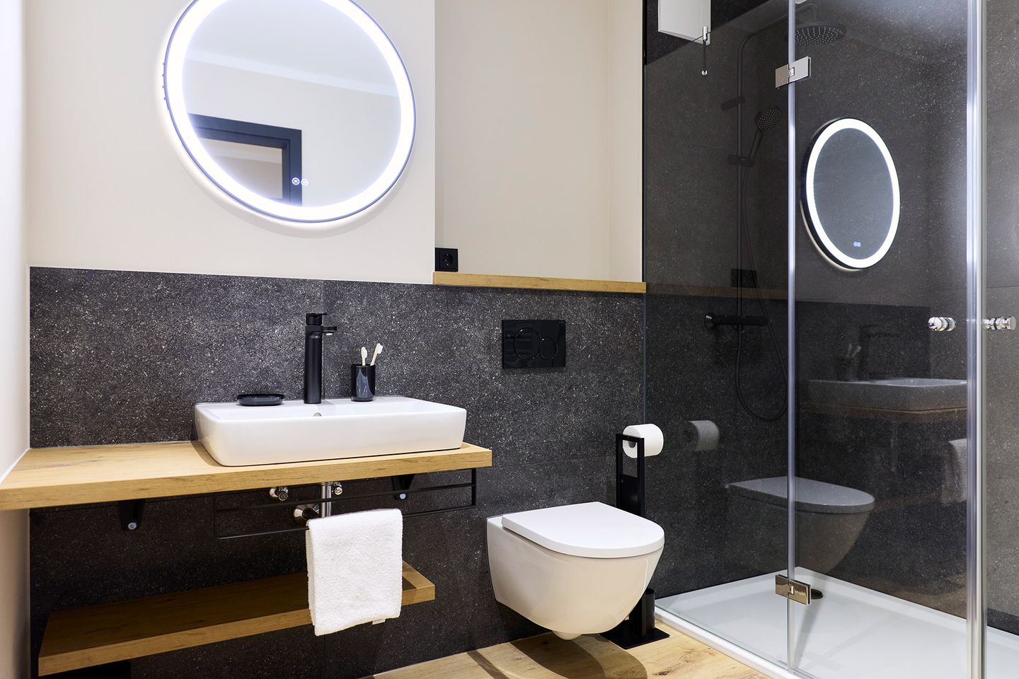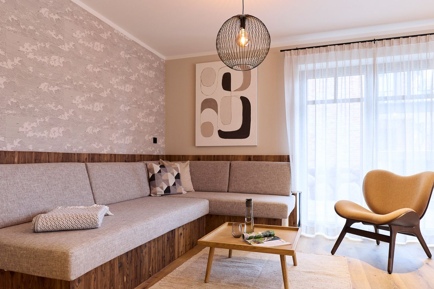 Der offen gestaltete Wohn-Essbereich mit integrierter Küche wird von zwei Seiten mit Tageslicht durchflutet. Der große Esstisch ist ein Ort zum Zusammensein ebenso wie die gemütliche Sofaecke in hellem Naturton. Die möblierte Terrasse in Nord- Ost/Nord-West-Lage bietet Raum für entspannte Momente. Die zwei Schlafzimmer sind mit je einem komfortablen Doppelbett, Schrank und Smart TV ausgestattet. Zudem verfügt das Apartment über ein modernes, mit anthrazitfarbenen Natursteinfliesen gestaltetes Badezimmer und ein separates WC.