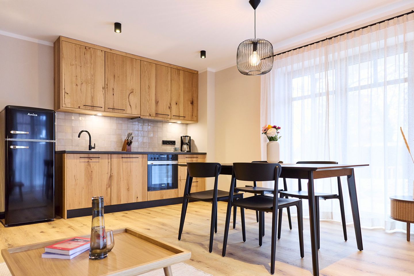 Der offen gestaltete Wohn-Essbereich mit integrierter Küche wird von zwei Seiten mit Tageslicht durchflutet. Der große Esstisch ist ein Ort zum Zusammensein ebenso wie die gemütliche Sofaecke in hellem Naturton. Auf der möblierten Terrasse lässt sich der Urlaubstag mit einem Frühstück in der Sonne beginnen. Die zwei Schlafzimmer sind mit je einem komfortablen Doppelbett, Schrank und Smart TV ausgestattet. Zudem verfügt das Apartment über ein modernes, mit anthrazitfarbenen Natursteinfliesen gestaltetes Badezimmer und ein separates WC.