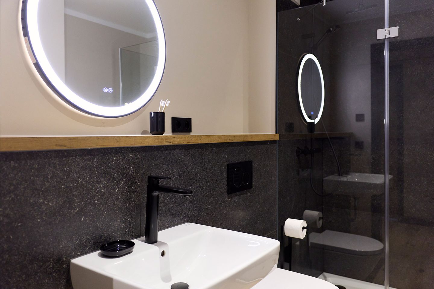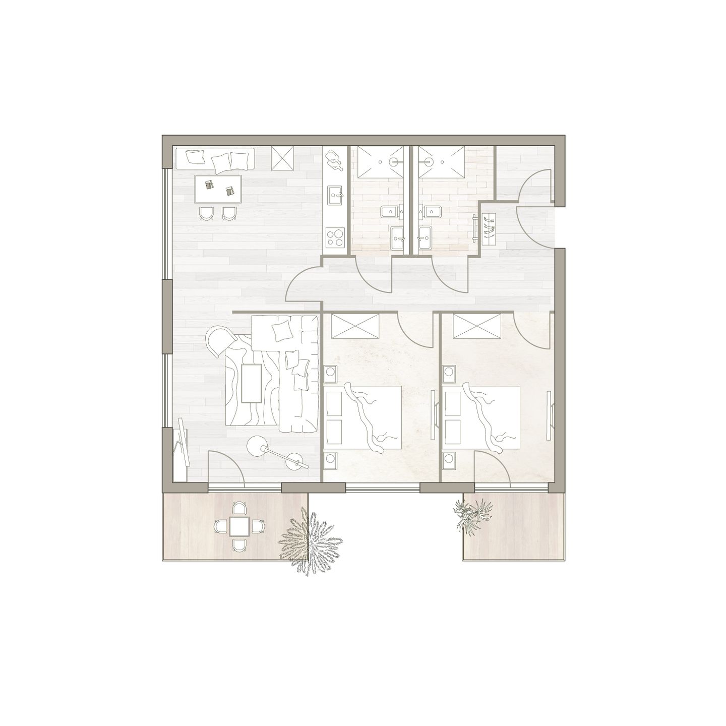 Die zwei Schlafzimmer sind mit je einem komfortablen Doppelbett, Schrank und Smart TV ausgestattet. Ein Plus: ein zweiter Balkon am vorderen Zimmer. Zudem verfügt das Apartment über ein stilvolles Badezimmer, ein WC und einen Abstellraum.