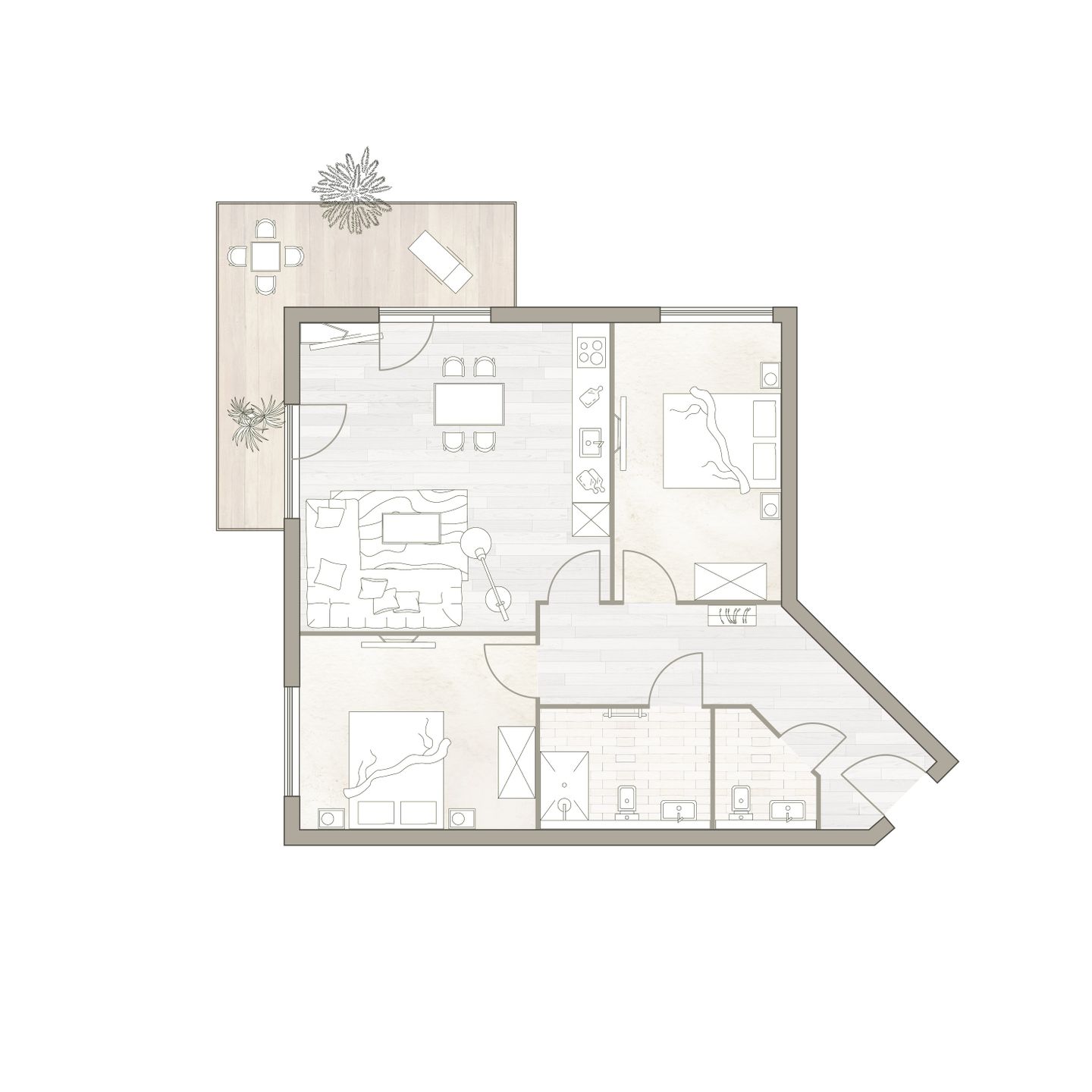Der offen gestaltete Wohn-Essbereich mit integrierter Küche wird von zwei Seiten mit Tageslicht durchflutet. Der große Esstisch ist ein Ort zum Zusammensein ebenso wie die gemütliche Sofaecke in hellem Naturton. Der möblierte Balkon in Nord-Ost/ Nord-West-Lage bietet Raum für entspannte Momente. Die zwei Schlafzimmer sind mit je einem komfortablen Doppelbett, Schrank und Smart TV ausgestattet. Zudem verfügt das Apartment über ein modernes, mit anthrazitfarbenen Natursteinfliesen gestaltetes Badezimmer und ein separates WC.