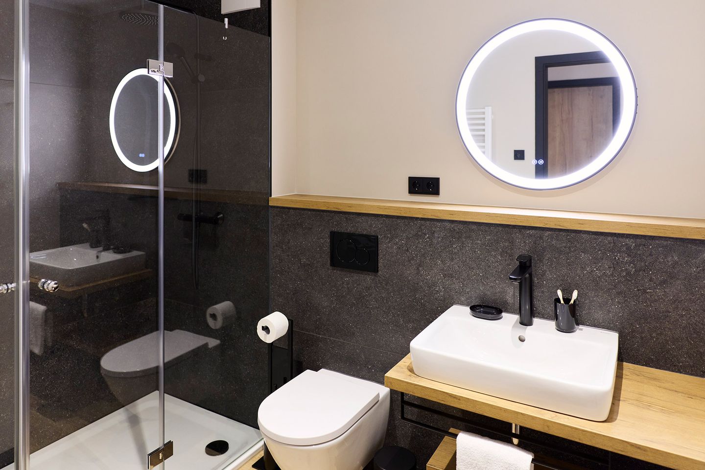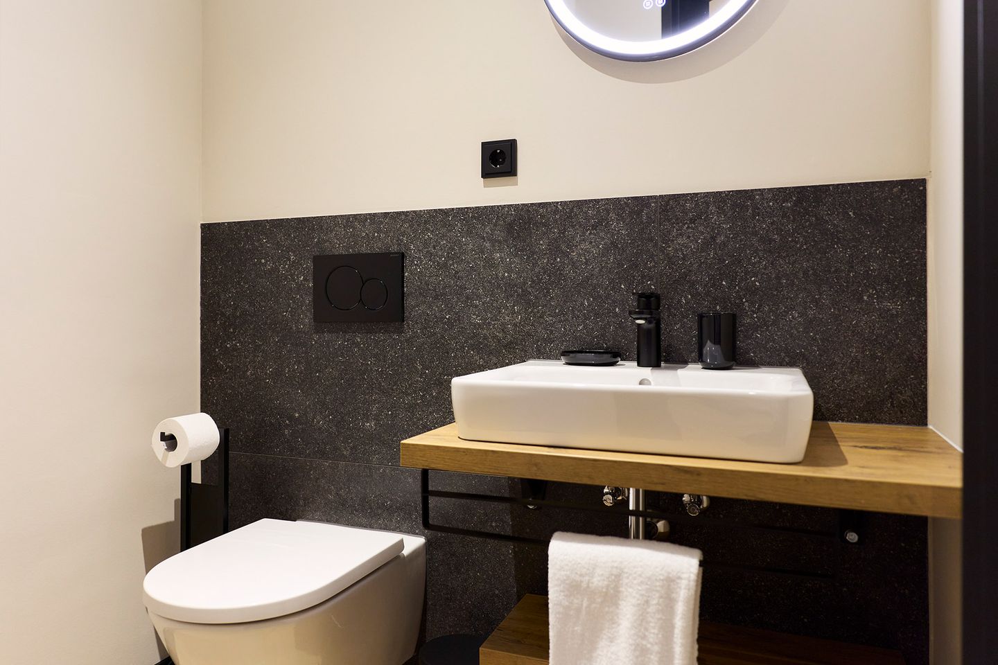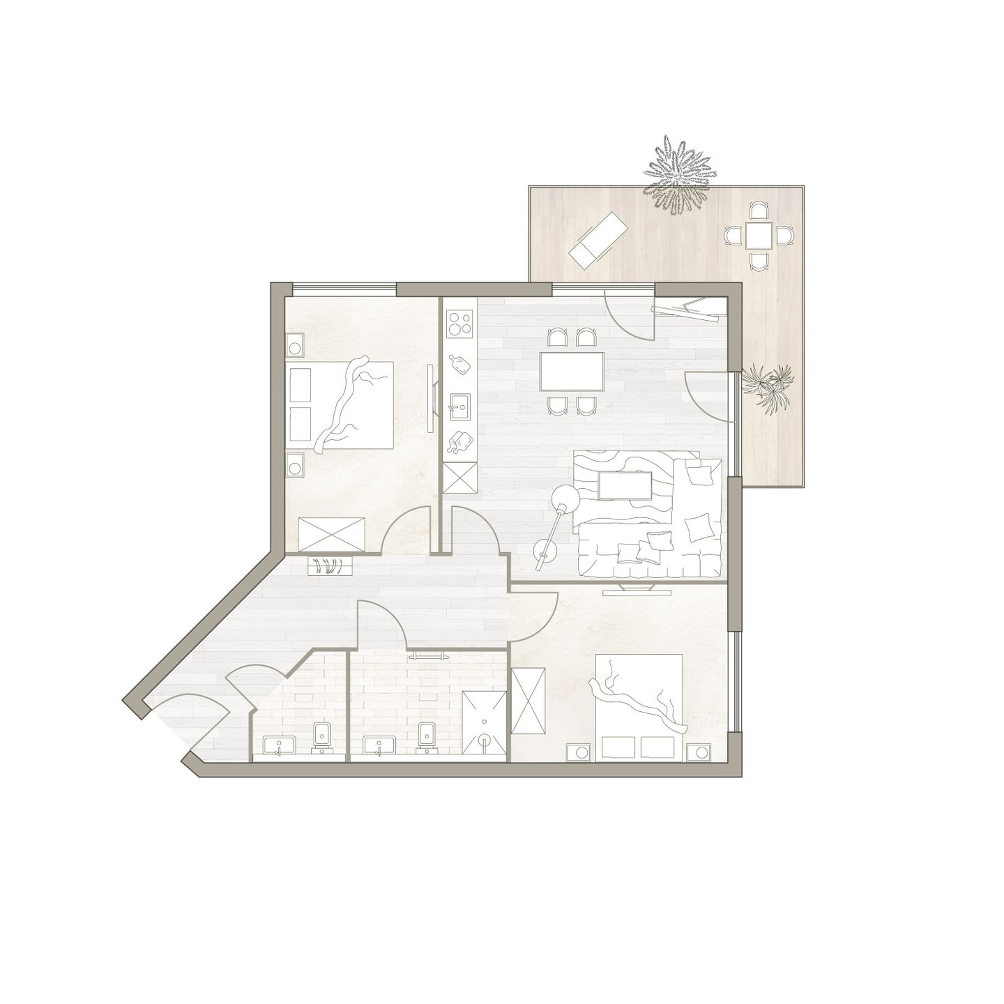 Der offen gestaltete Wohn-Essbereich mit integrierter Küche wird von zwei Seiten mit Tageslicht durchflutet. Der große Esstisch ist ein Ort zum Zusammensein ebenso wie die gemütliche Sofaecke in hellem Naturton. Auf dem möblierten Balkon lässt sich der Urlaubstag mit einem Frühstück in der Sonne beginnen. Die zwei Schlafzimmer sind mit je einem komfortablen Doppelbett, Schrank und Smart TV ausgestattet. Zudem verfügt das Apartment über ein modernes, mit anthrazitfarbenen Natursteinfliesen gestaltetes Badezimmer und ein separates WC.