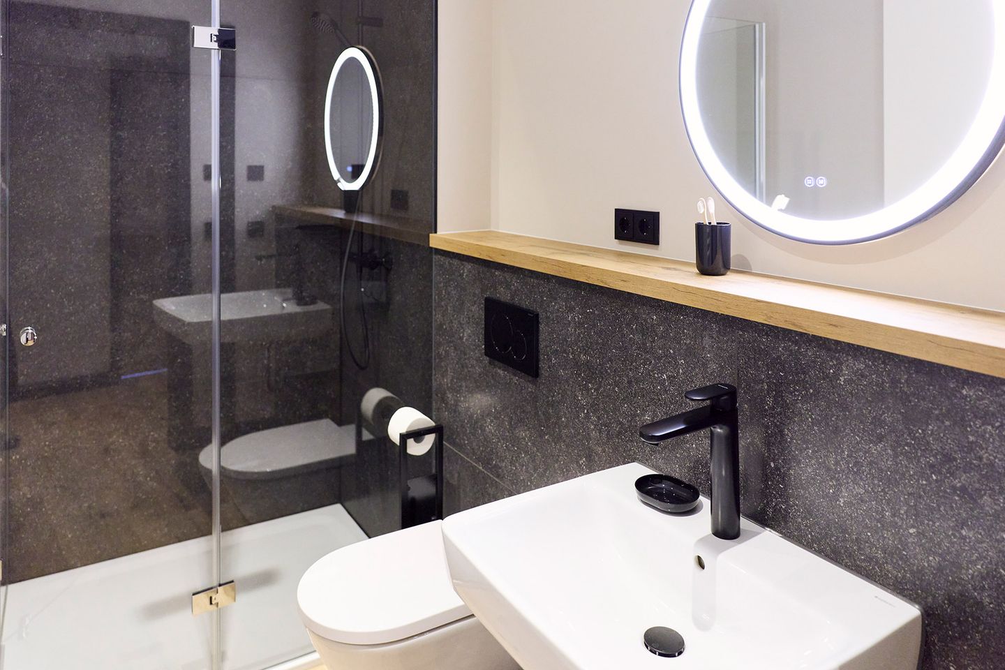 Die zwei Schlafzimmer sind mit je einem komfortablen Doppelbett, Schrank und Smart TV ausgestattet. Ein Plus: ein zweiter Balkon am vorderen Zimmer. Zudem verfügt das Apartment über ein stilvolles Badezimmer, ein WC und einen Abstellraum.