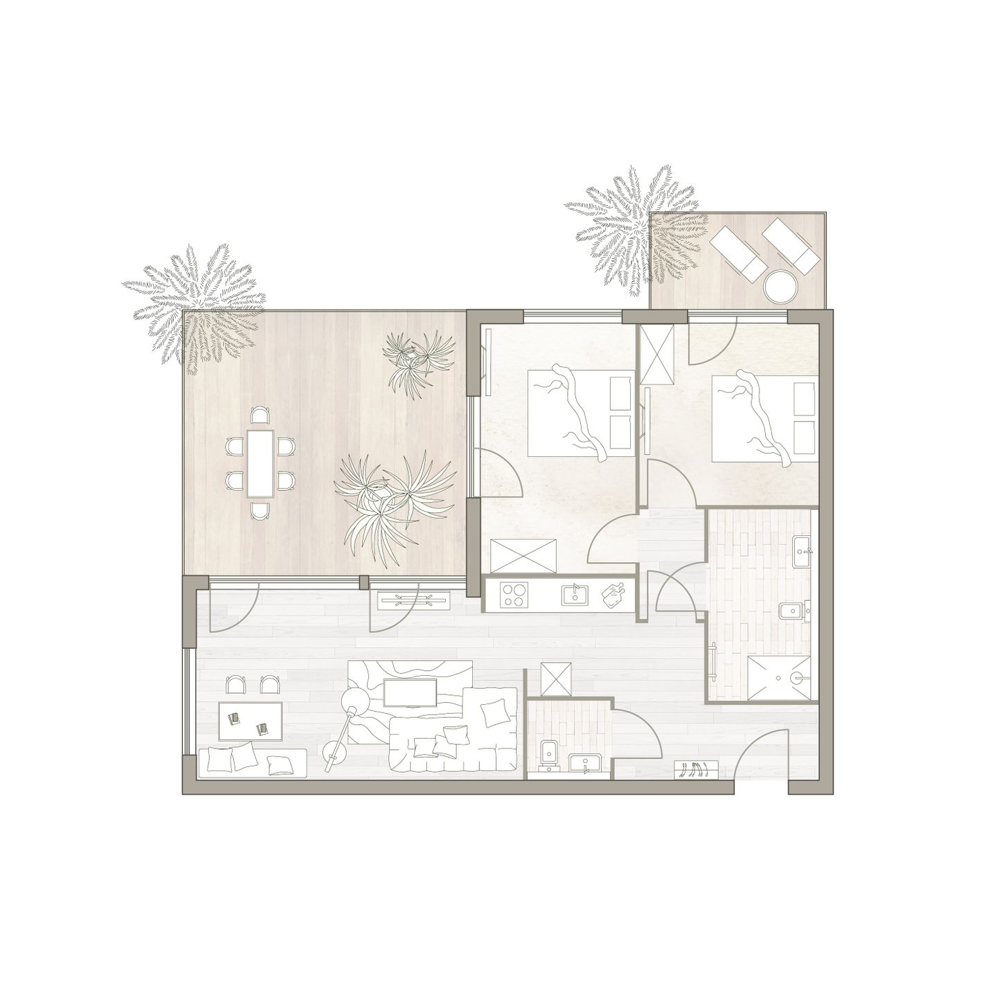 Der offen gestaltete Wohn-Essbereich mit integrierter Küche wird von zwei Seiten mit Tageslicht durchflutet. Der Essplatz ist ein Ort zum Zusammensein ebenso wie die gemütliche Sofaecke in hellem Naturton. Die große, möblierte Dachterrasse in Nord-West/Nord-Ost-Lage bietet Raum für entspannte Momente. Die zwei Schlafzimmer sind mit je einem komfortablen Doppelbett, Schrank und Smart TV ausgestattet, eines der Zimmer zudem mit einem eigenen Balkon. Ein stilvolles Badezimmer und ein separates WC ergänzen die durchdachte Raumaufteilung.