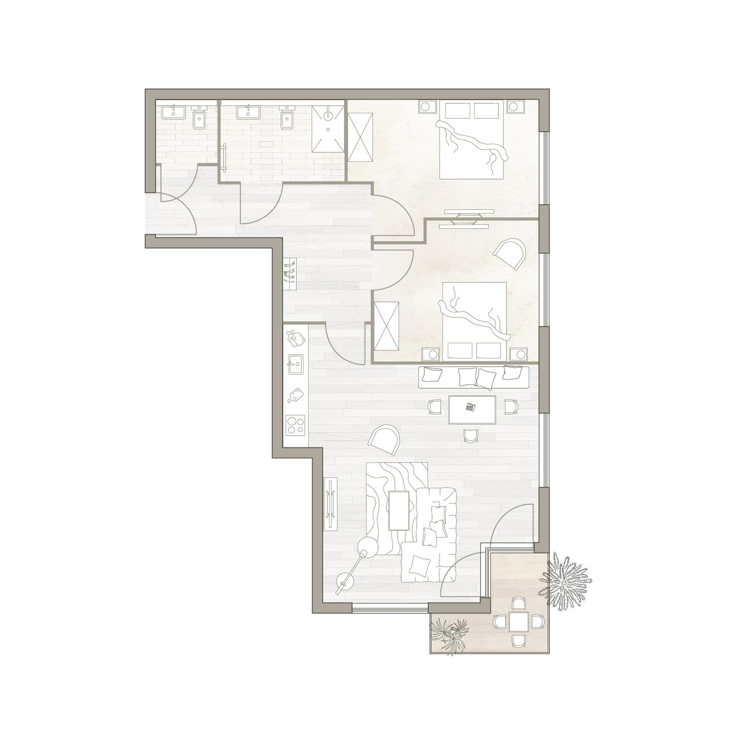 Der offen gestaltete Wohn-Essbereich mit integrierter Küche wird von zwei Seiten mit Tageslicht durchflutet. Ein großer Esstisch ist ein Ort zum Zusammensein ebenso wie die gemütliche Sofaecke in hellem Naturton. Auf der möblierten Terrasse lässt sich der Urlaubstag mit einem Frühstück in der Sonne beginnen. Die zwei Schlafzimmer sind mit je einem komfortablen Doppelbett, Schrank und Smart TV ausgestattet. Zudem verfügt das Apartment über ein modernes, mit anthrazitfarbenen Natursteinfliesen gestaltetes Badezimmer und ein separates WC.