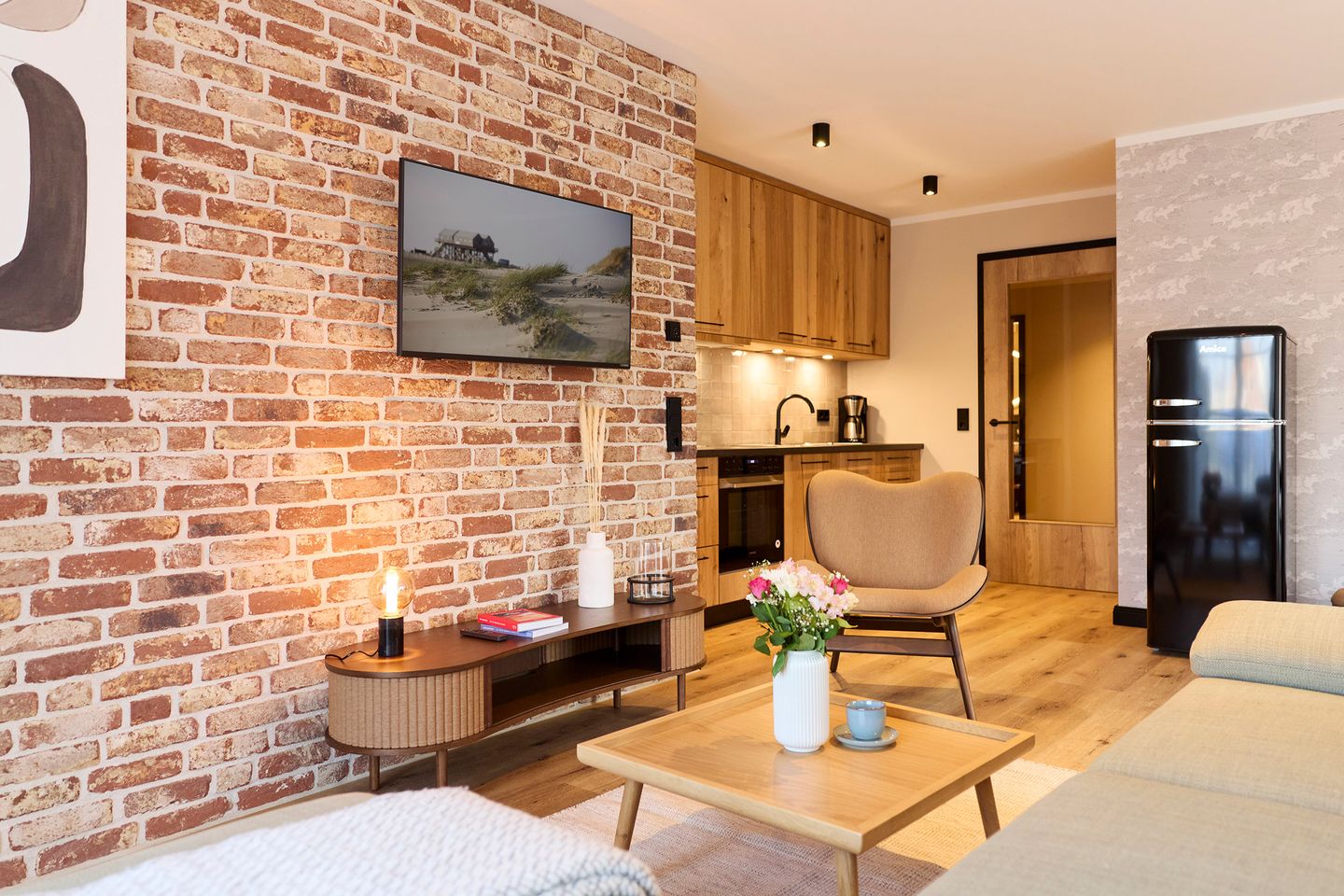 Auf rund 85 Quadratmetern finden vier Gäste Ihr kleines Urlaubsrefugium mit nordischem Wohlfühldesign. Genießen Sie das entspannte Ambiente im lässigen Industrial Style, das gleichzeitig jede Menge Cozyness versprüht.