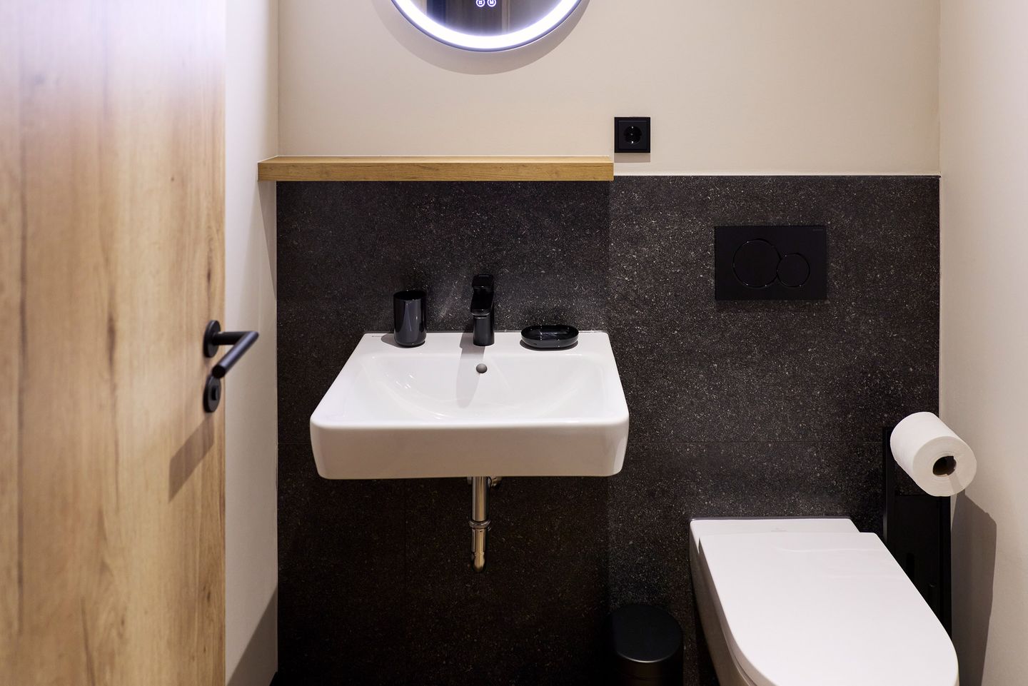 Auf der möblierten Terrasse lässt sich der Urlaubstag mit einem Frühstück in der Sonne beginnen. Die zwei Schlafzimmer sind mit je einem komfortablen Doppelbett, Schrank und Smart TV ausgestattet. Zudem verfügt das Apartment über ein modernes, mit anthrazitfarbenen Natursteinfliesen gestaltetes Badezimmer und ein separates WC.