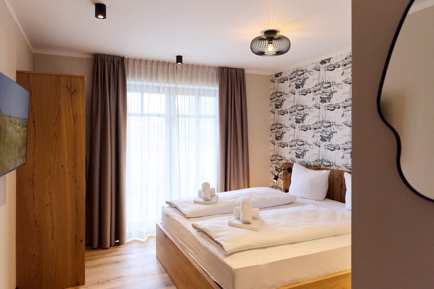 Der offen gestaltete Wohn-Essbereich mit integrierter Küche wird von Nord-Osten mit Tageslicht durchflutet. Ein kleiner Esstisch ist ein Ort zum Zusammensein ebenso wie die gemütliche Sofaecke in hellem Naturton. Auf der geschützten, möblierten Terrasse lässt sich der Urlaubstag mit einem Frühstück in der Sonne beginnen. Das separate Schlafzimmer ist mit einem komfortablen Doppelbett, Schrank und Smart TV ausgestattet. Ein Plus: der direkte Zugang zur Terrasse! Zudem verfügt das Apartment über ein modernes, mit Natursteinfliesen gestaltetes Bad.