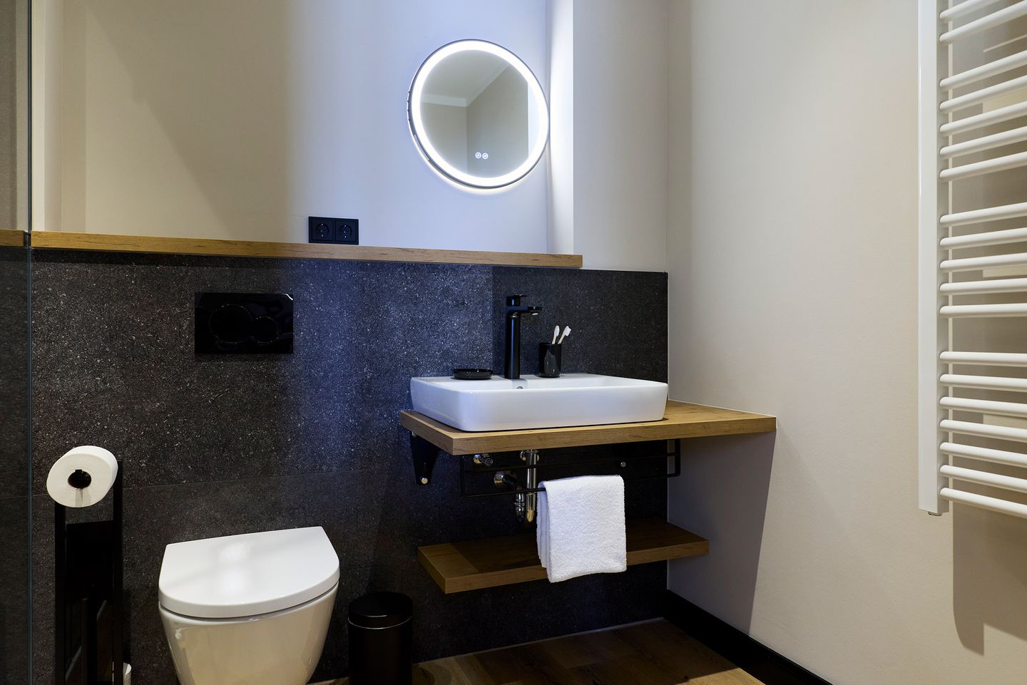 Ein möblierter Balkon mit West-Ausrichtung bietet Sonne bis in den Abend hinein. Die zwei Schlafzimmer sind mit je einem komfortablen Doppelbett, Schrank und Smart TV ausgestattet. Zudem verfügt das Apartment über ein modernes, mit anthrazitfarbenen Natursteinfliesen gestaltetes Badezimmer und ein separates WC.