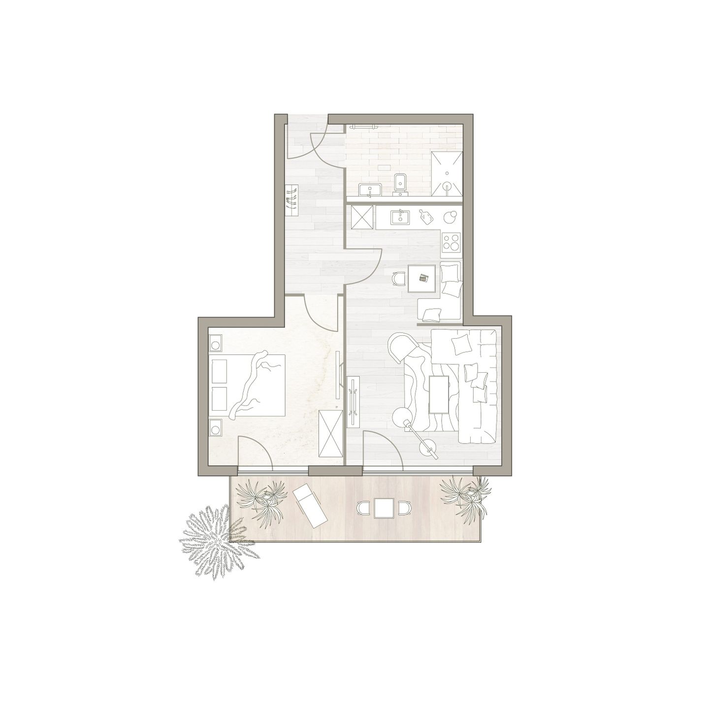 Der offen gestaltete Wohn-Essbereich mit integrierter Küche wird von Süd-Westen mit Tageslicht durchflutet. Ein kleiner Esstisch ist ein Ort zum Zusammensein ebenso wie die gemütliche Sofaecke in hellem Naturton. Der möblierte Süd-West-Balkon bietet Sonne bis in den Abend hinein. Das Schlafzimmer ist mit einem komfortablen Doppelbett, Schrank und Smart TV ausgestattet. Ein Plus: der direkte Zugang zum Balkon! Zudem verfügt das Apartment über ein modernes, mit Natursteinfliesen gestaltetes Badezimmer.