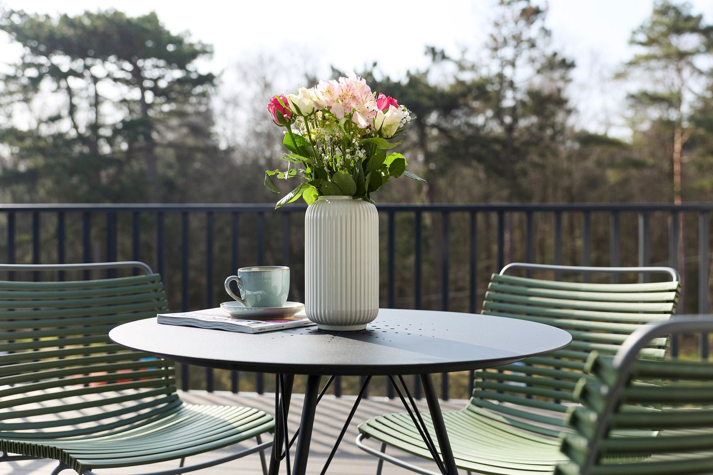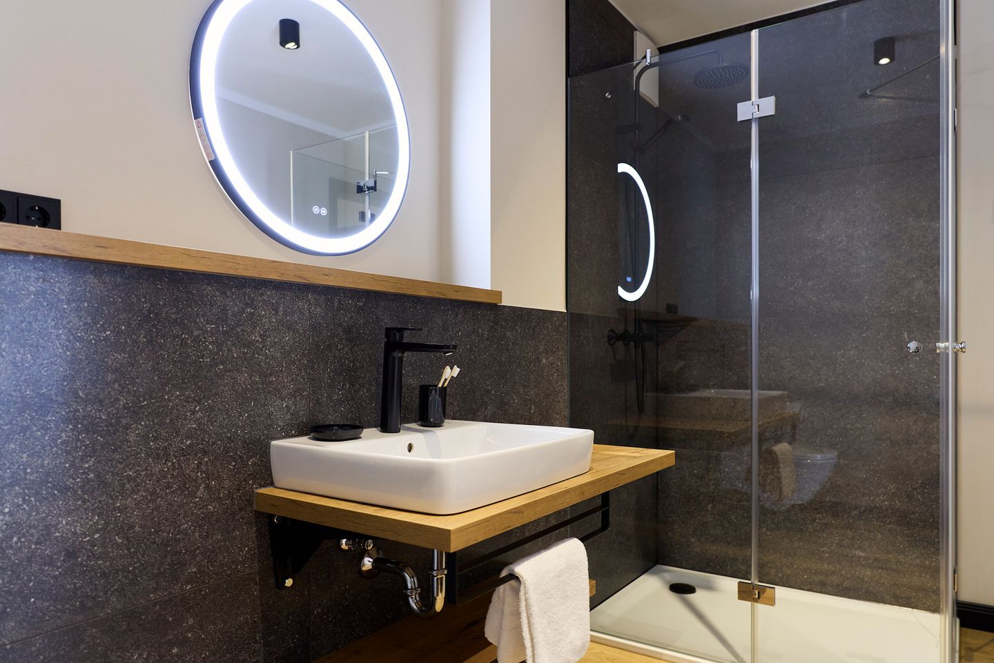 Die großzügige, möblierte Dachterrasse mit Süd-West-Ausrichtung bietet Sonne bis in den Abend hinein. Das Schlafzimmer ist mit einem komfortablen Doppelbett, Schrank und Smart TV ausgestattet. Ein Plus: ein eigener Balkon! Zudem verfügt das Apartment über ein modernes, mit anthrazitfarbenen Natursteinfliesen gestaltetes Badezimmer.
